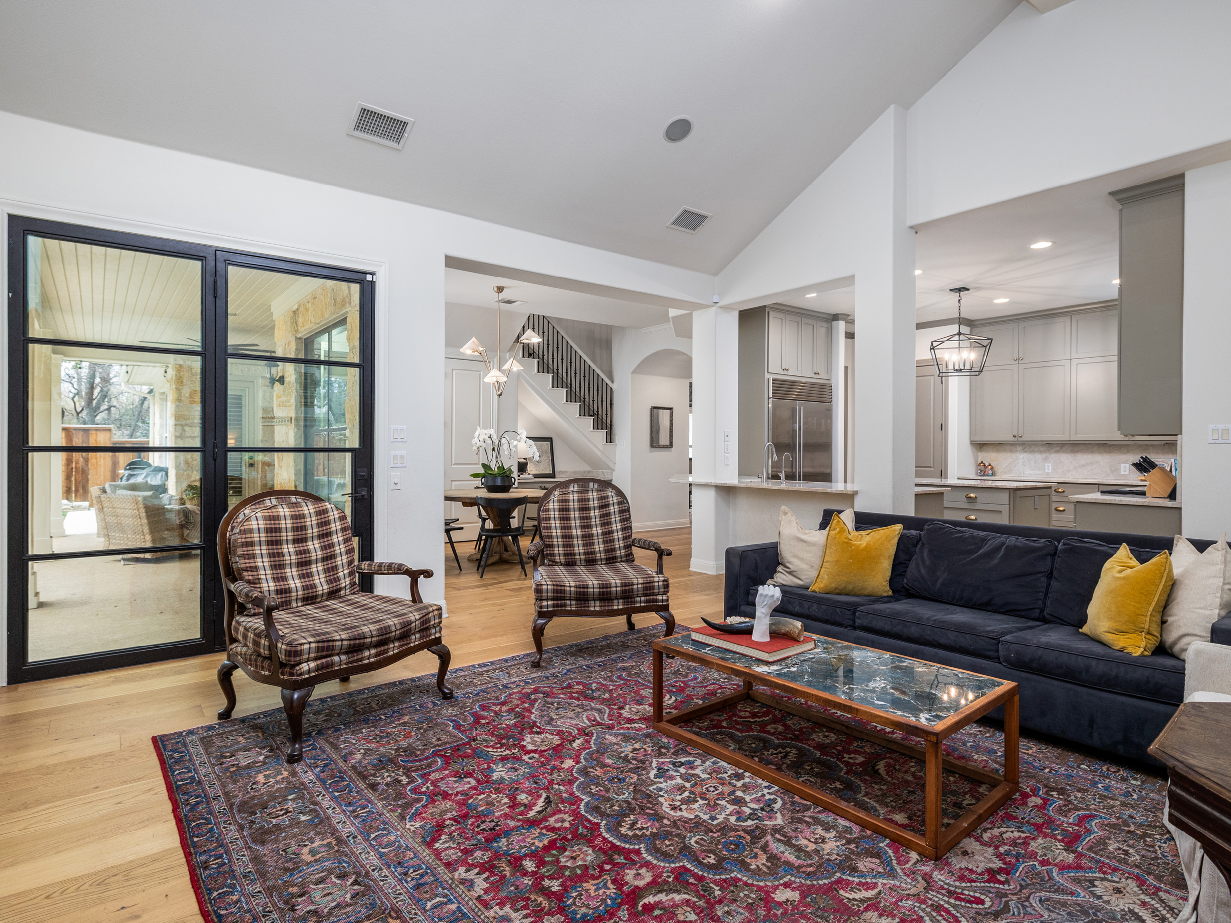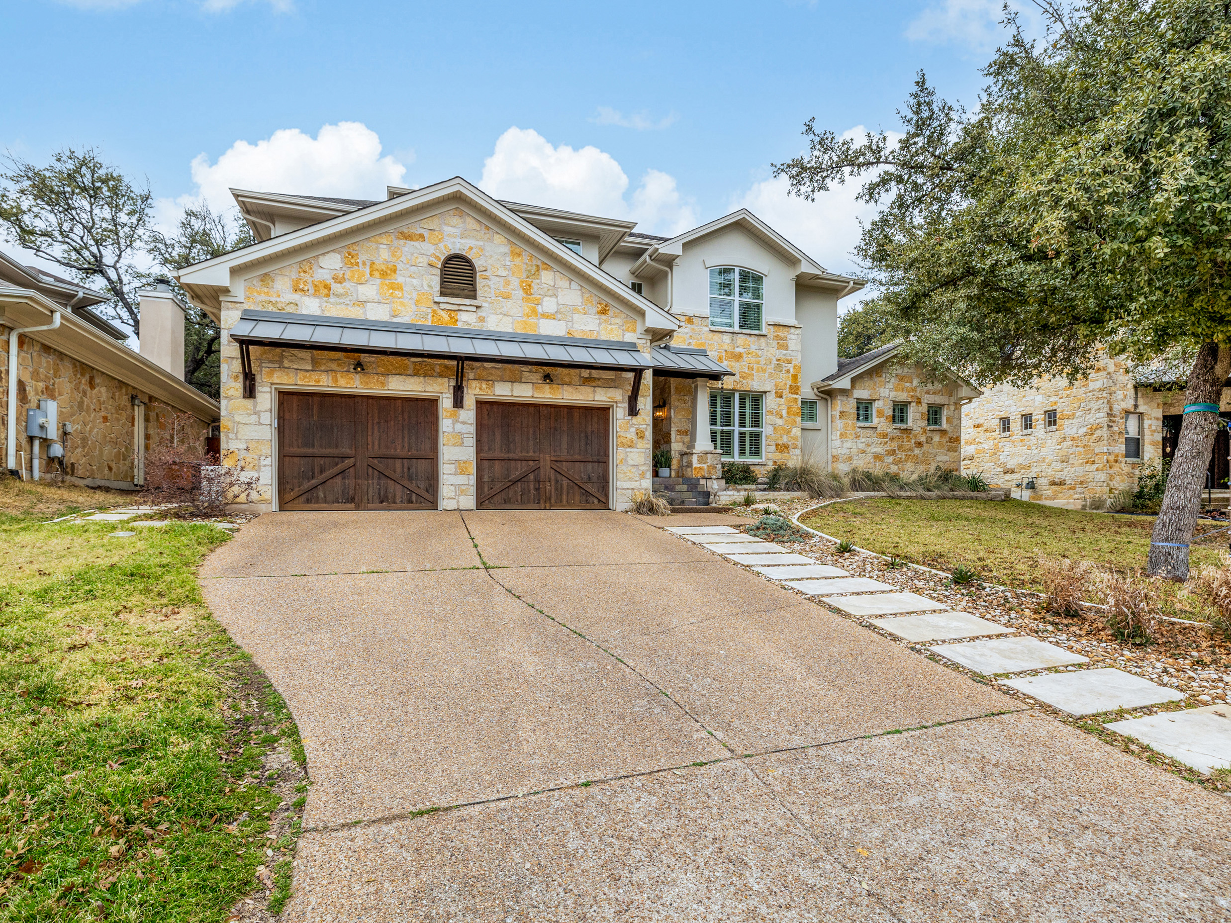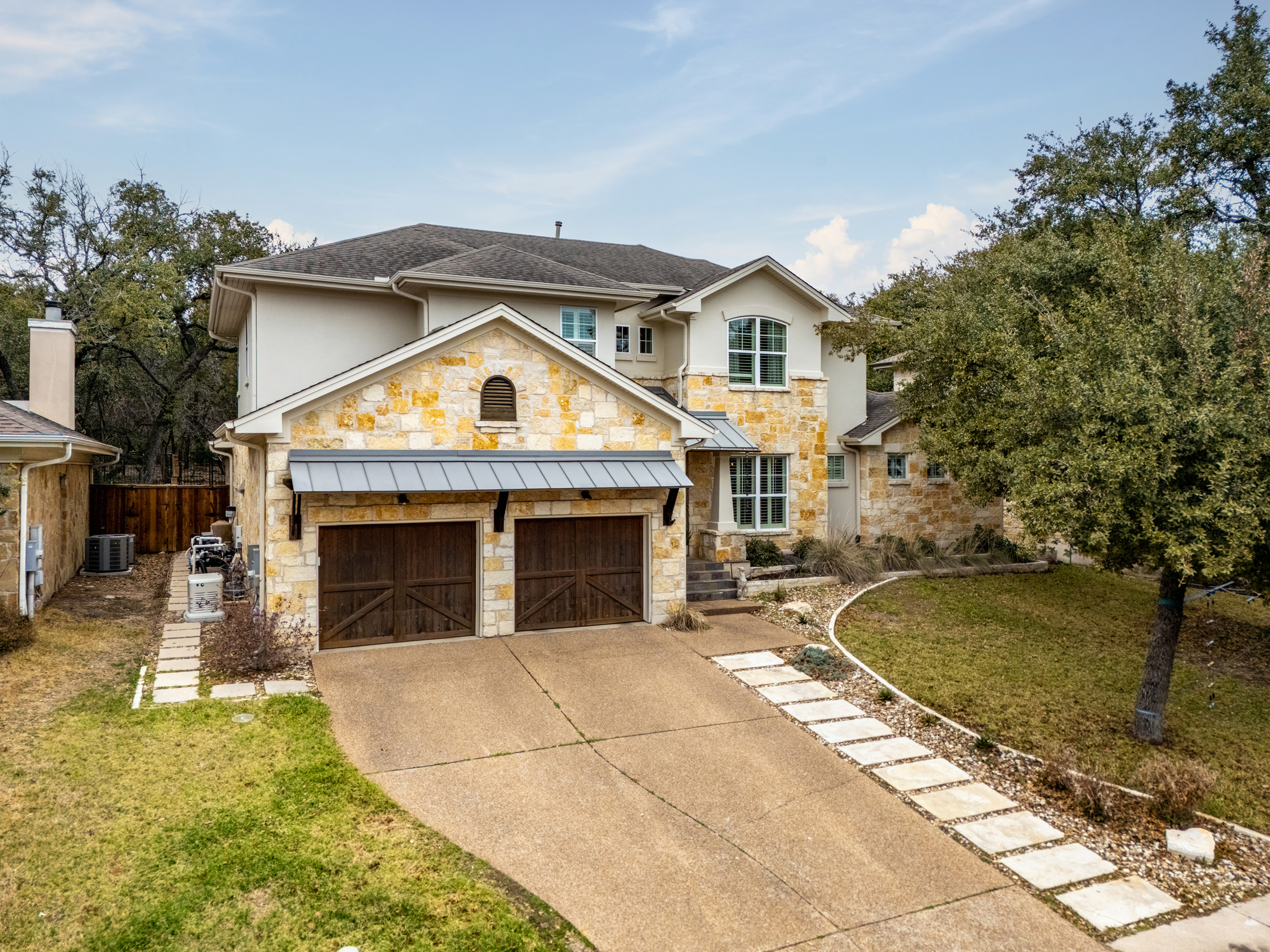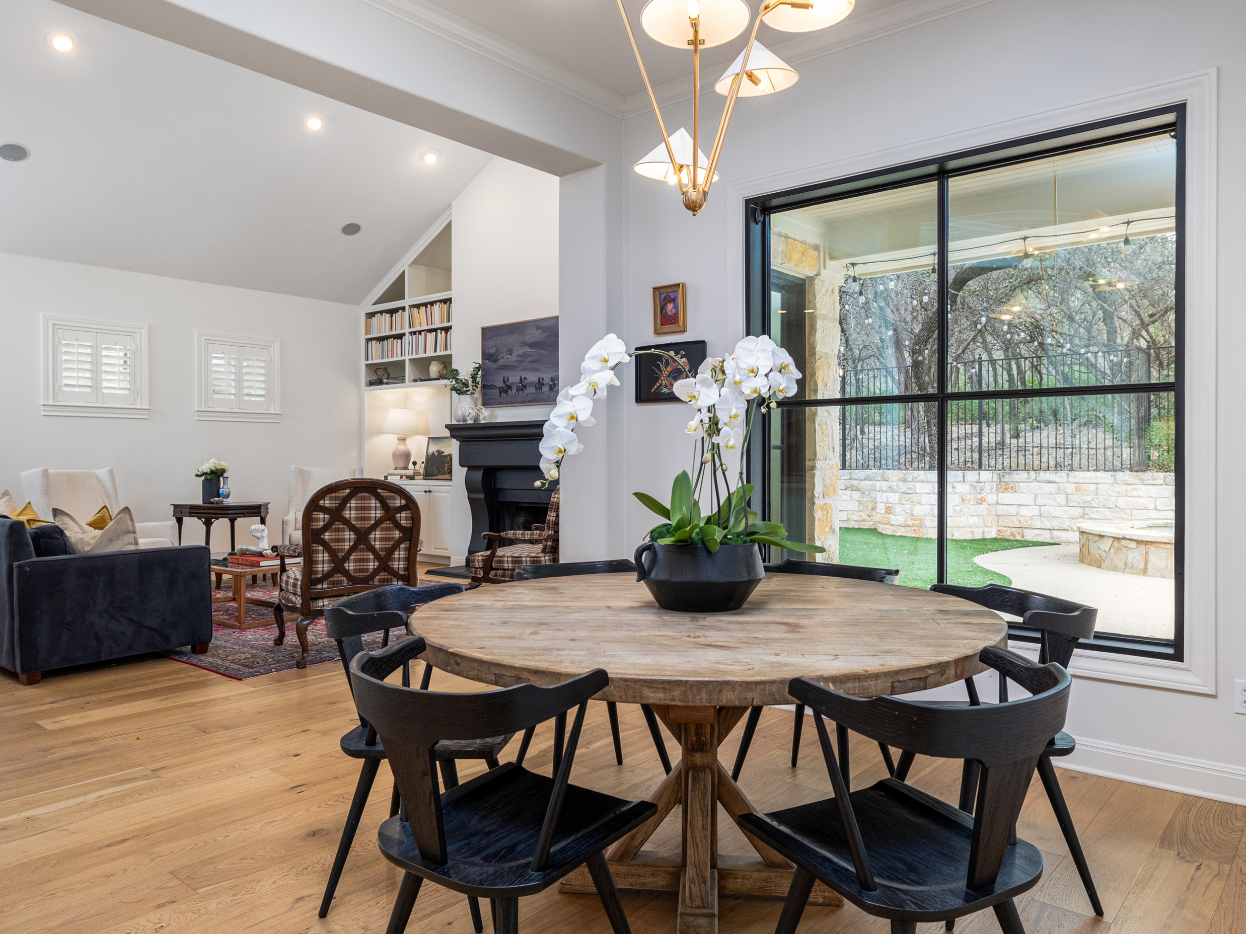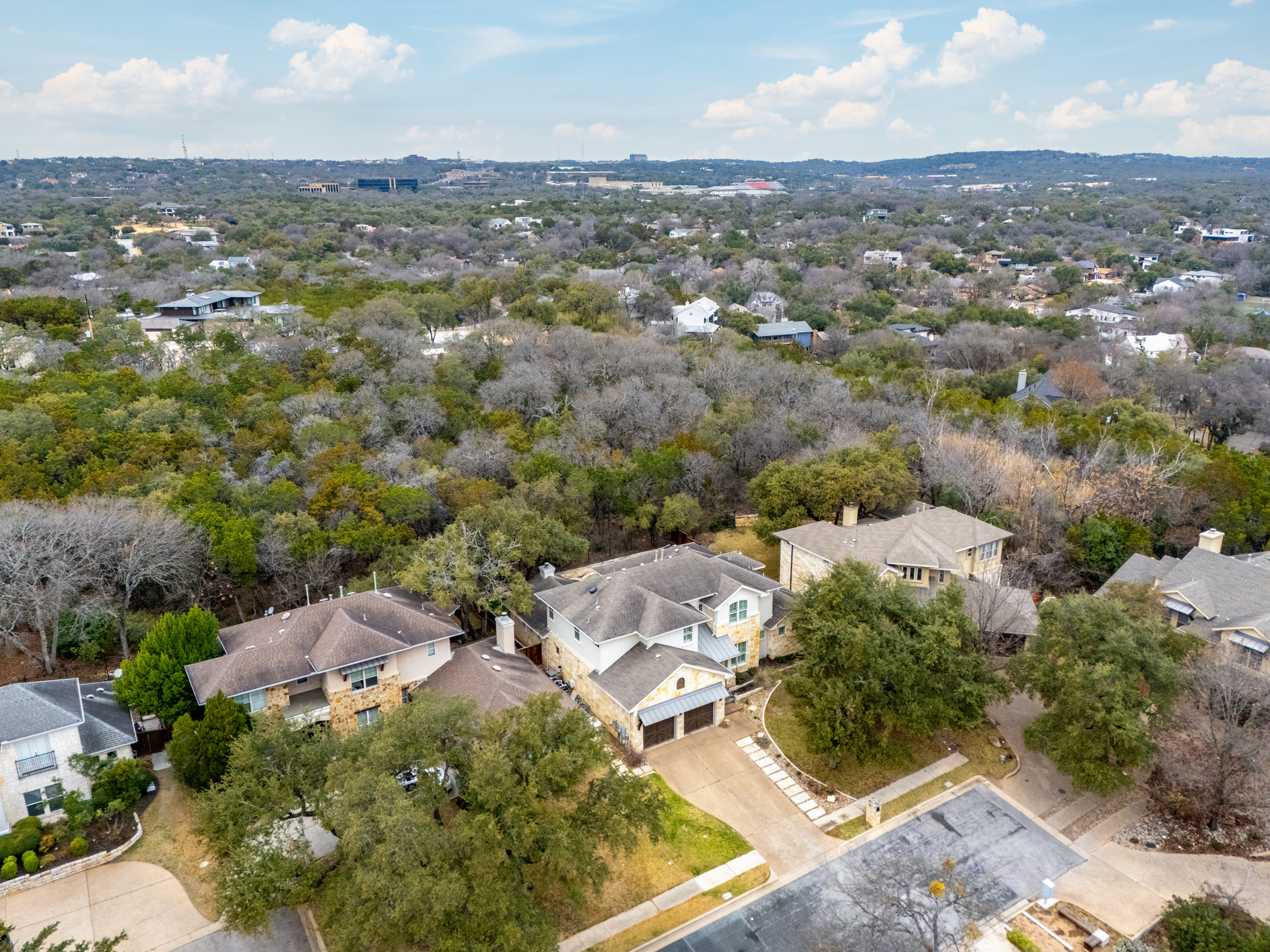 Located in The Overlook at Treemont in Westlake, this refined residence is tucked away on a quiet cul-de-sac, offering privacy, walkability, and a serene greenspace backdrop- within walking distance to Cedar Creek Elementary and Hill Country Middle School. A dramatic 20-foot foyer creates a striking first impression, crowned by a draped glass bronze chandelier that sets the tone for the home’s design-forward sophistication. White oak flooring flows throughout, complemented by plantation shutters, custom paint colors, and carefully curated designer details.