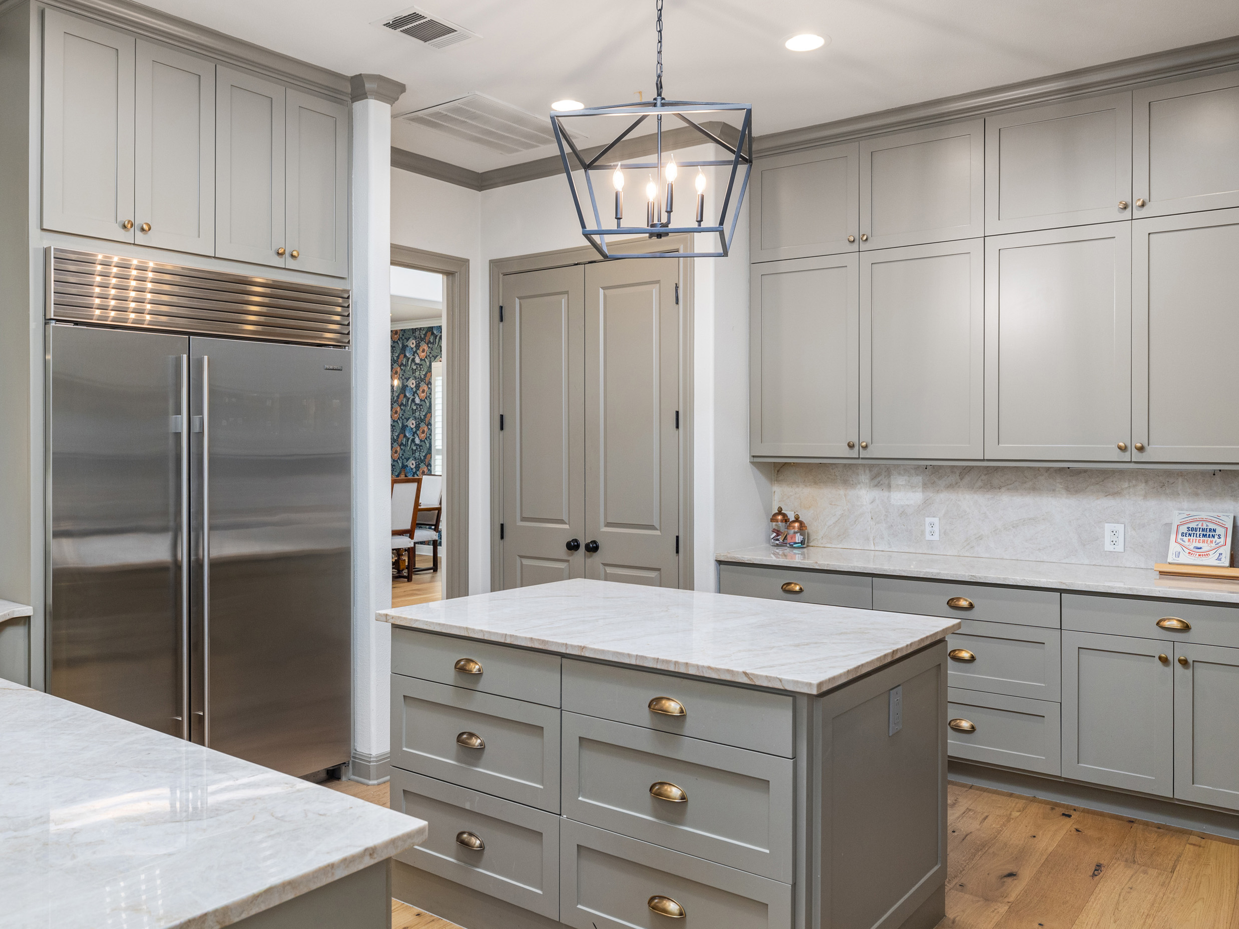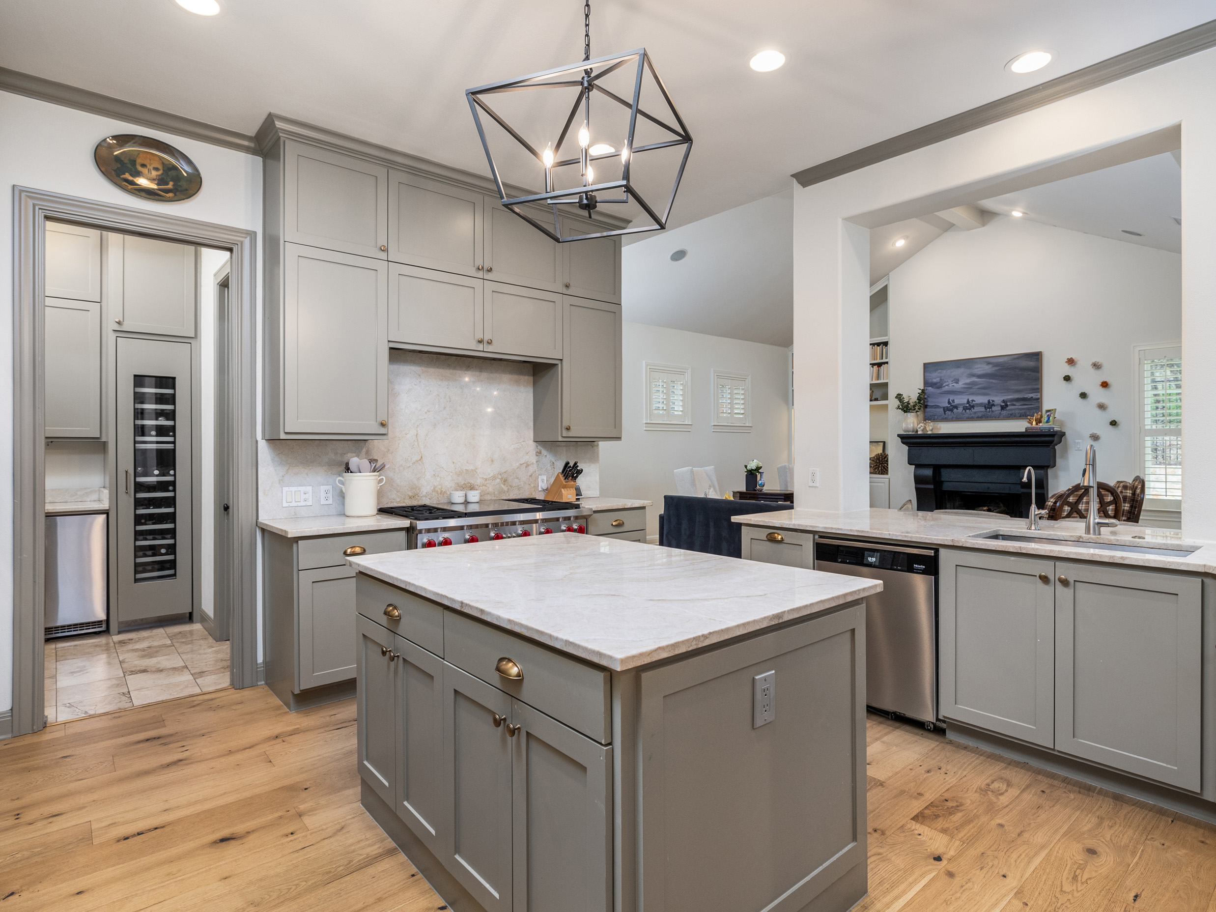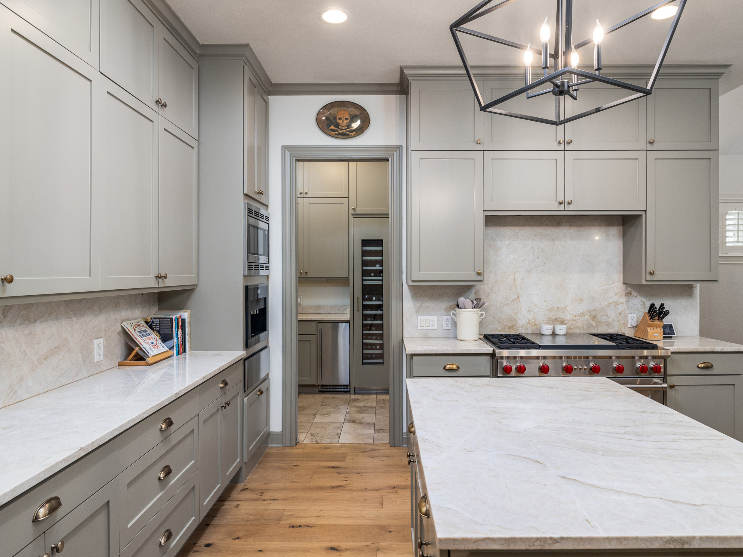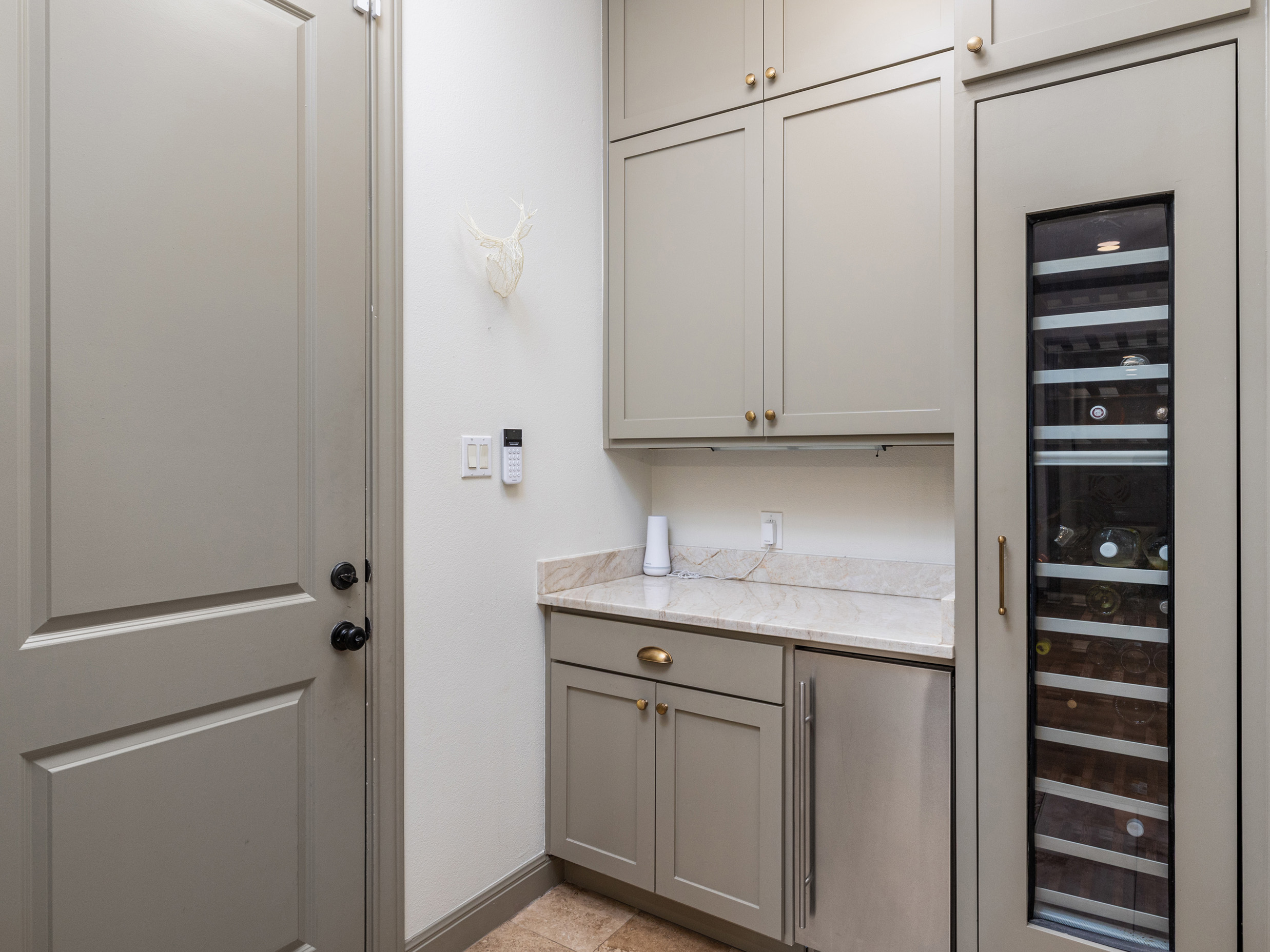 The kitchen is anchored by quartzite countertops and premium appliances, including a Wolf double oven, Miele built-in coffee maker, and wine refrigerator. A dedicated breakfast nook overlooks the backyard pool and tranquil greenspace, while thoughtful details- such as a built-in bar between the kitchen and laundry room and a coffee bar tucked beneath the staircase- elevate everyday living with both beauty and function.