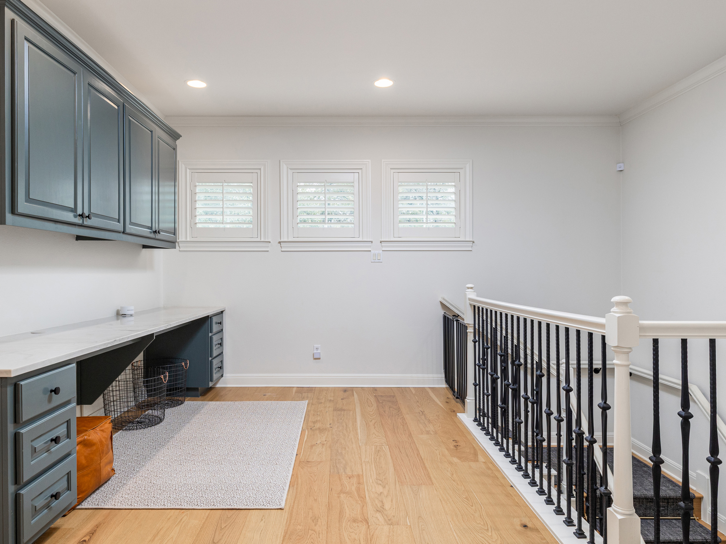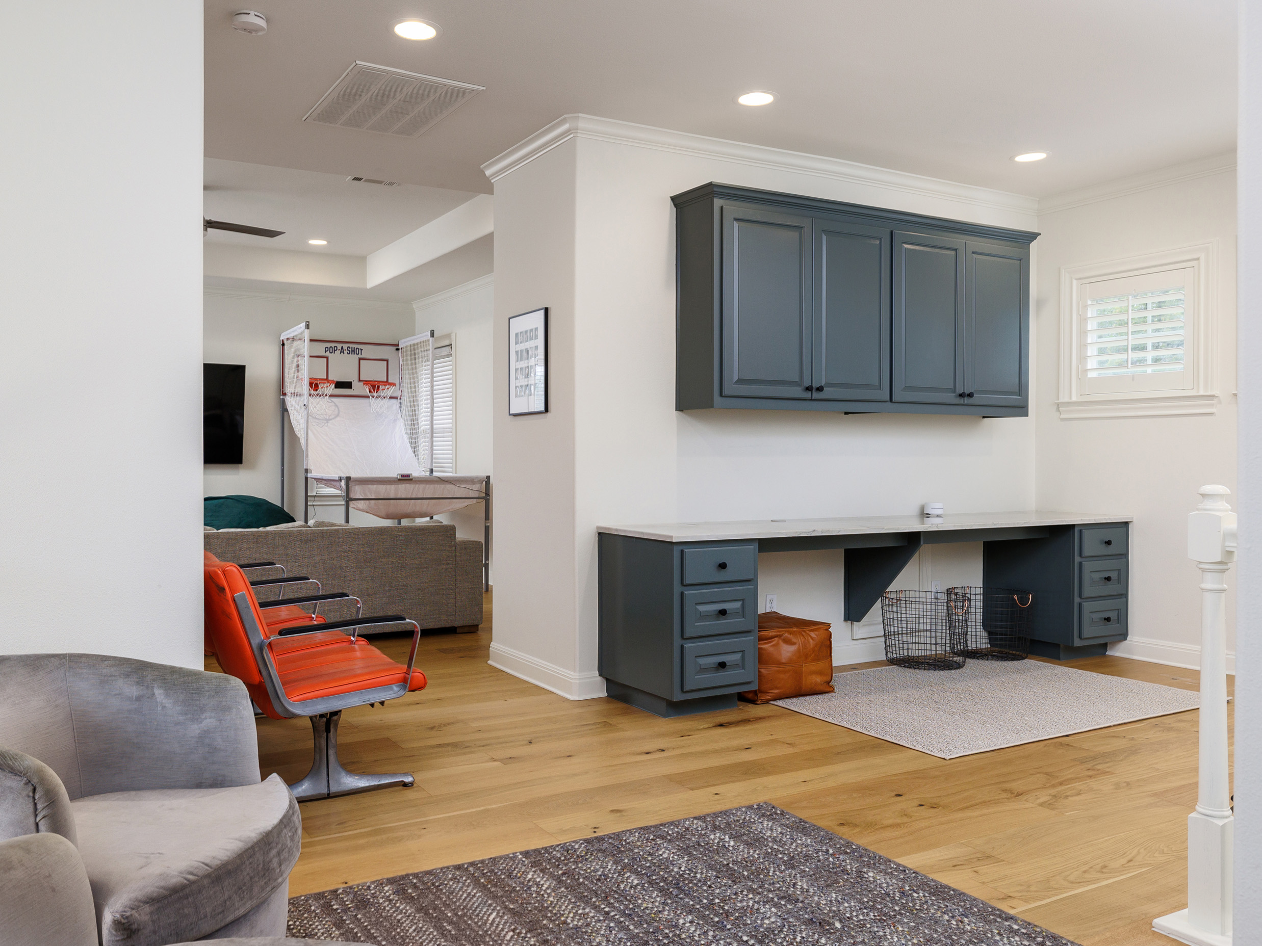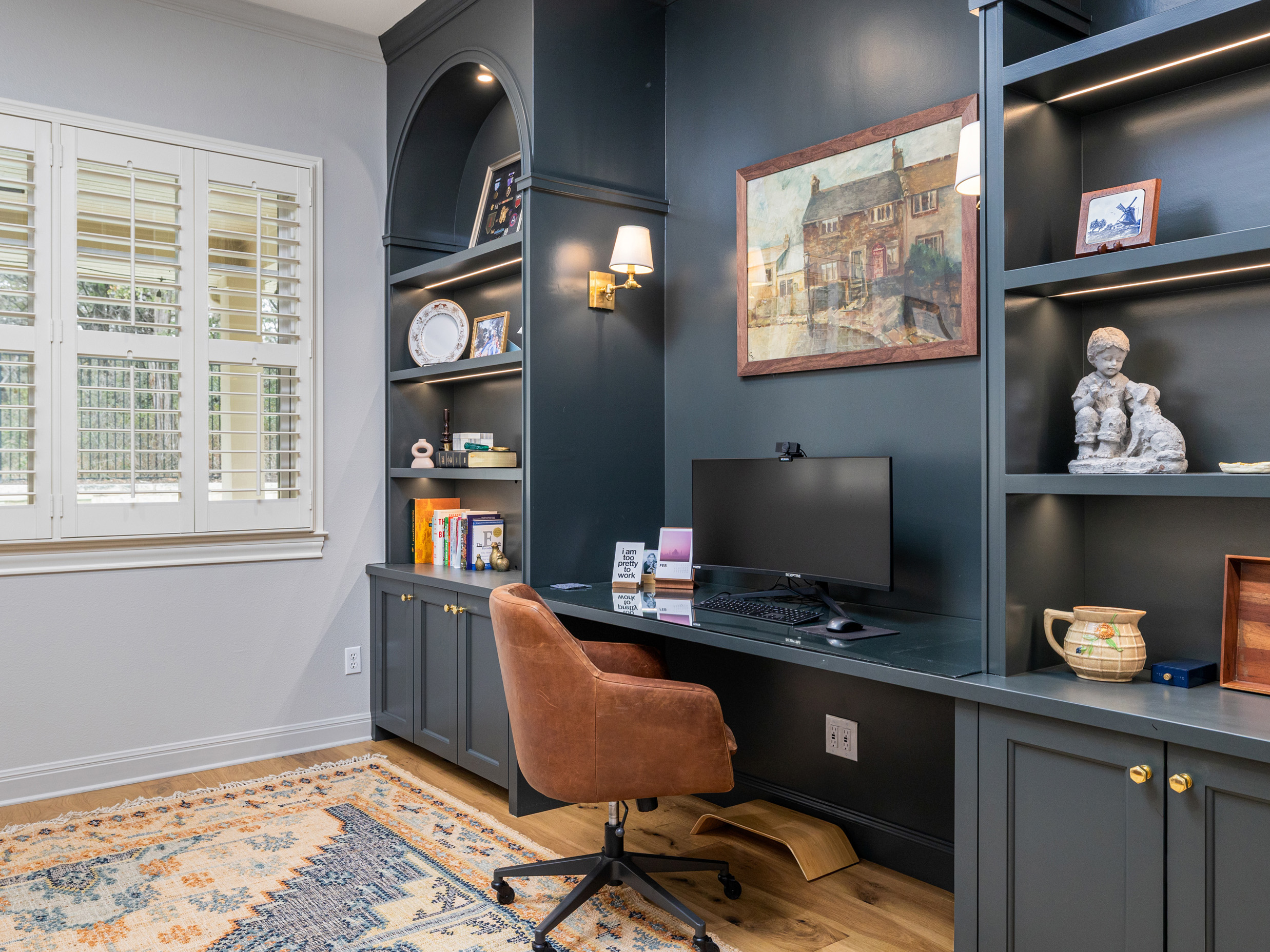 A downstairs office with built-in desk and storage offers a space that is both intentionally functional and aesthetically pleasing. With easy access to a full bathroom, it can also serve as a flexible fifth bedroom, ideal for guests or evolving lifestyle needs.