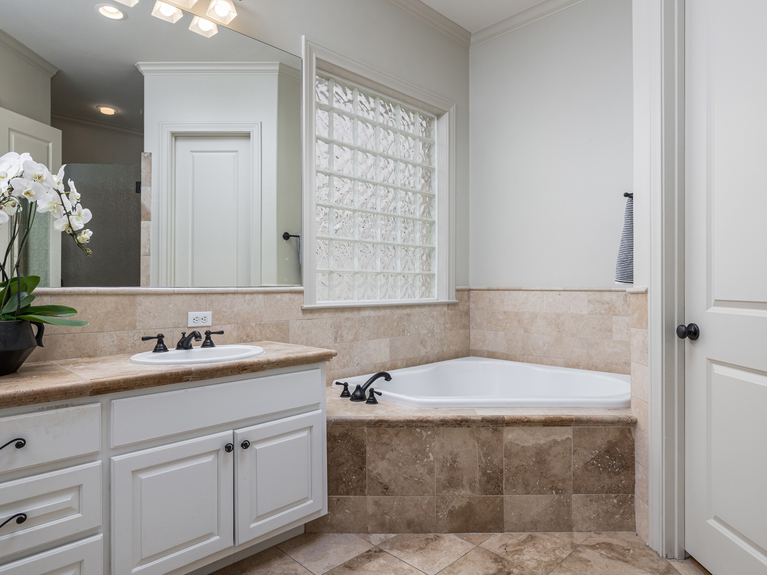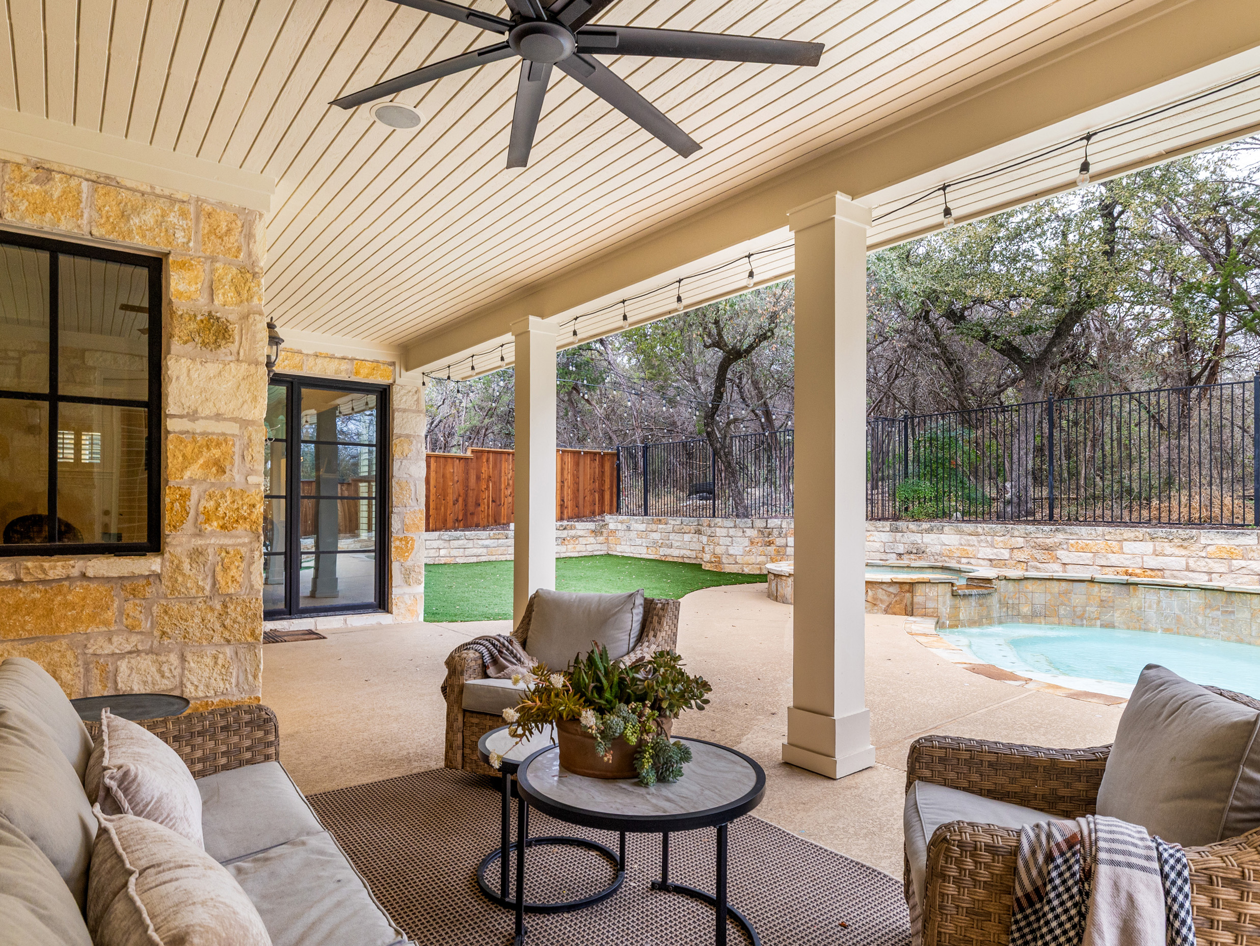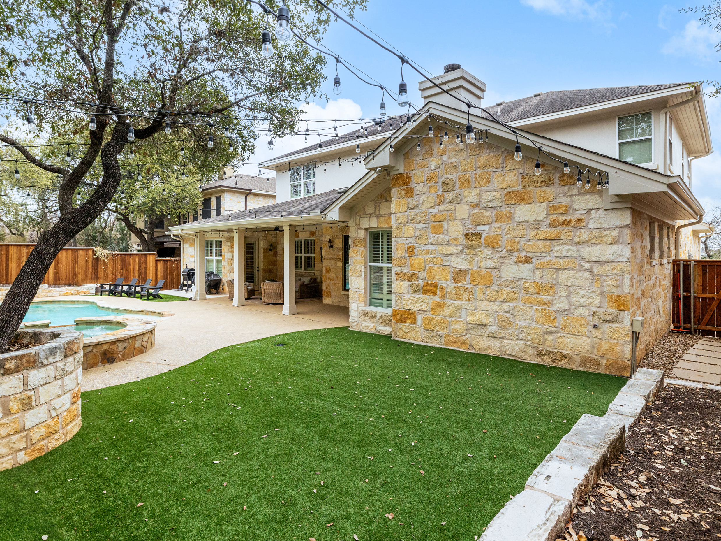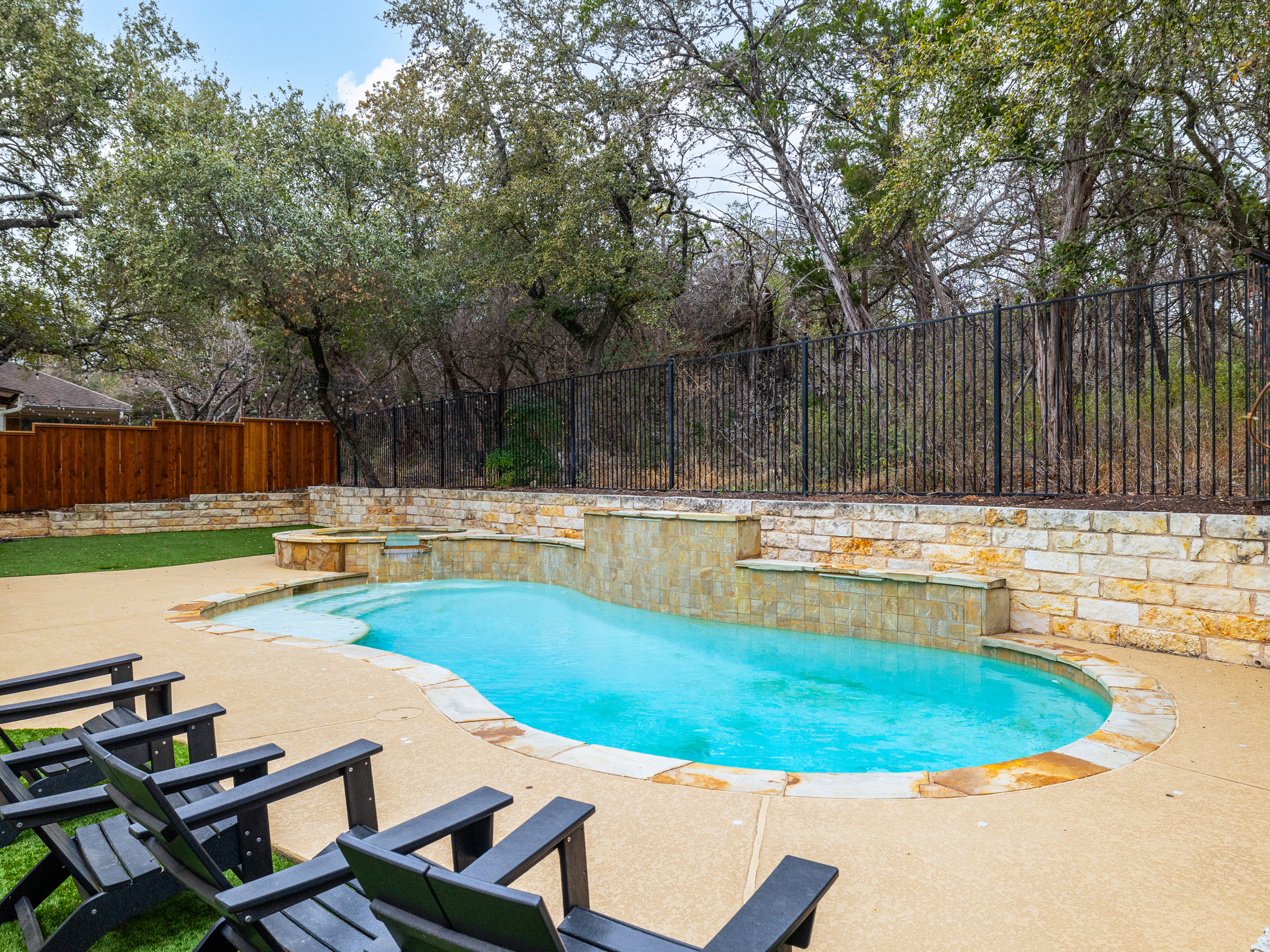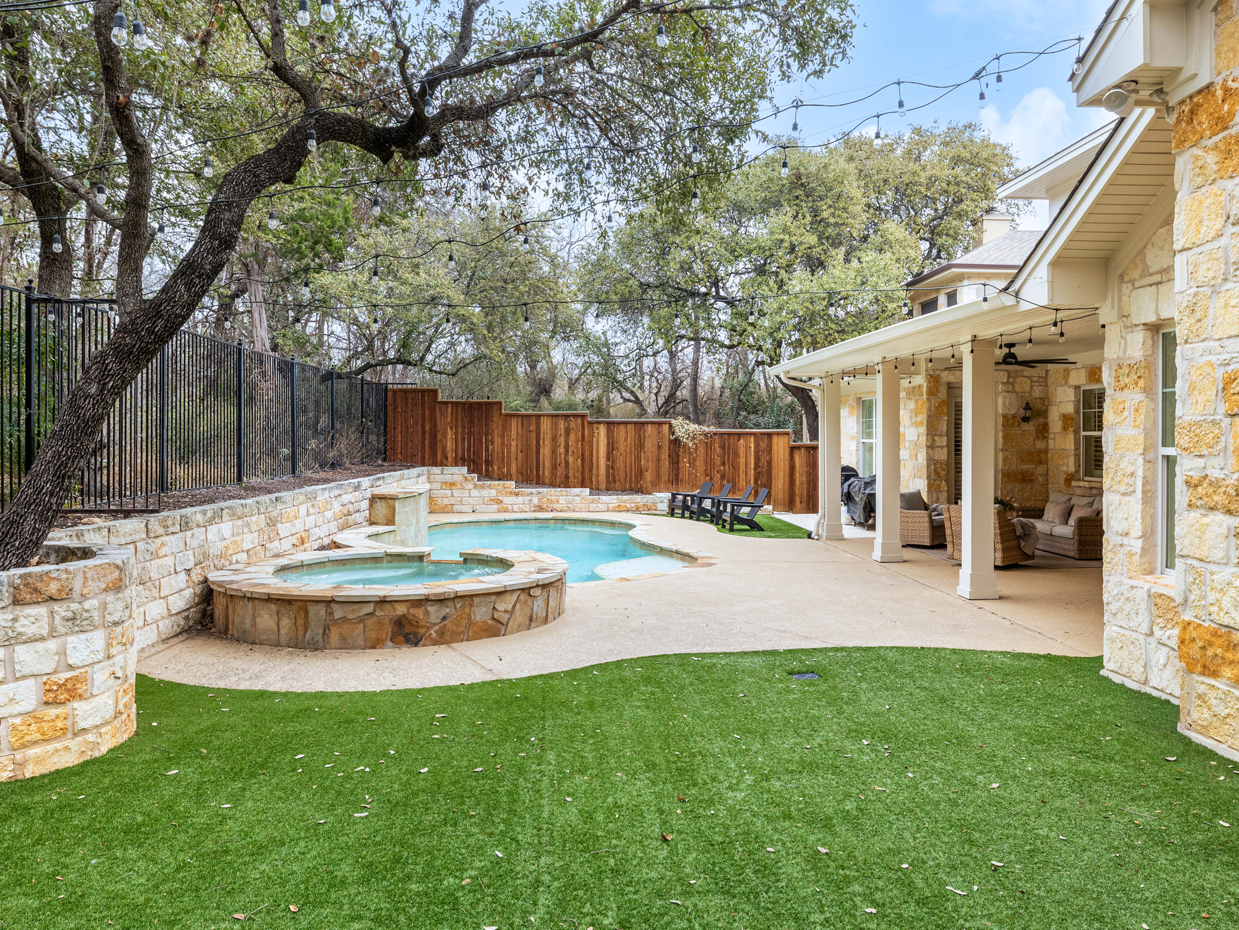 Outdoors, a resort-style pool with cascading waterfall and hot tub overlooks the peaceful greenspace beyond. A backup generator and two-car garage complete this thoughtfully designed home, balancing sophistication, flexibility, and long-term livability within one of Westlake’s most sought-after neighborhoods.