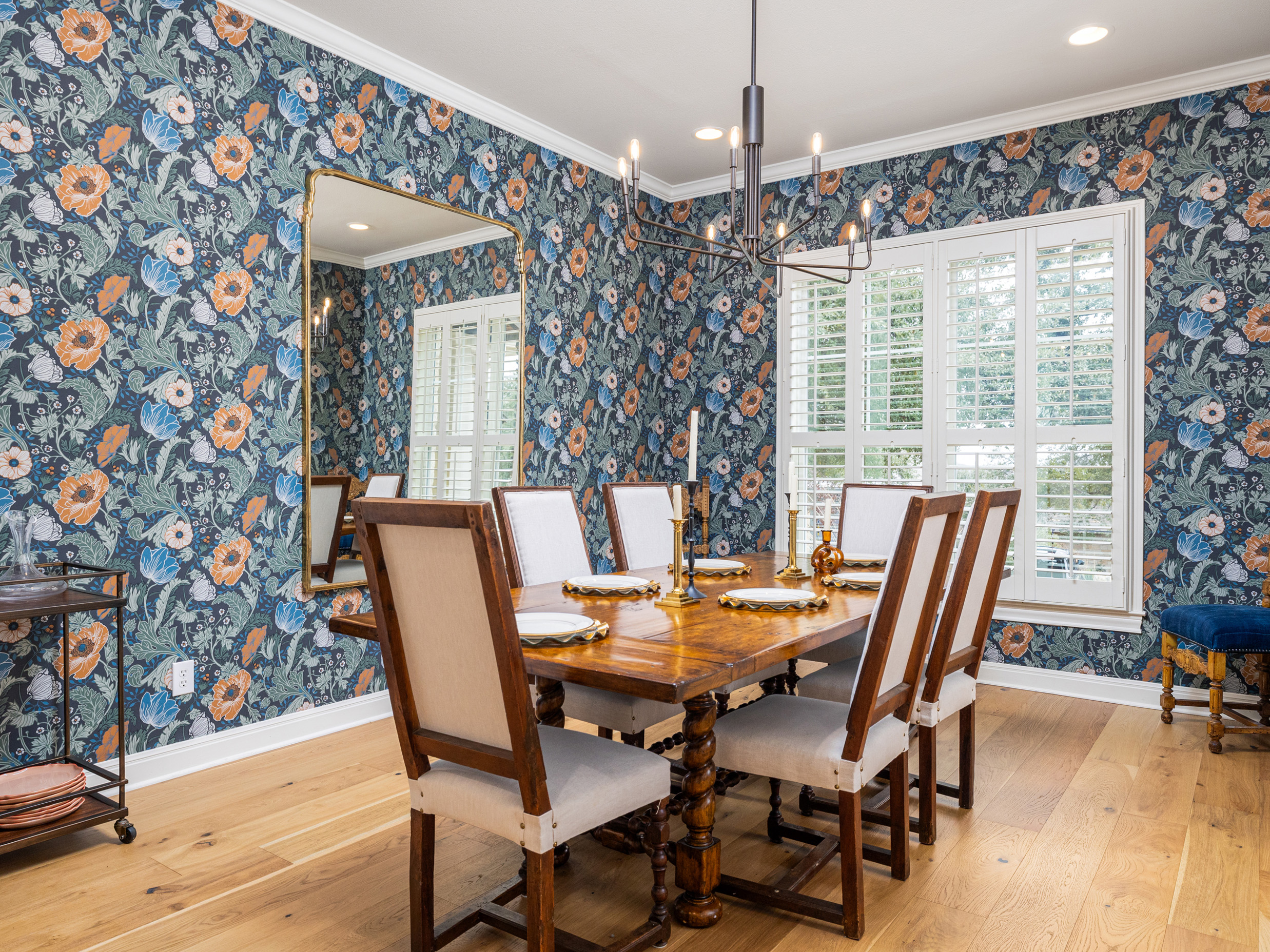 Just off the foyer, a formal dining room makes a bold statement with A-Street Anemone wallpaper and an aged brass chandelier, creating an elegant setting for both intimate dinners and special gatherings.