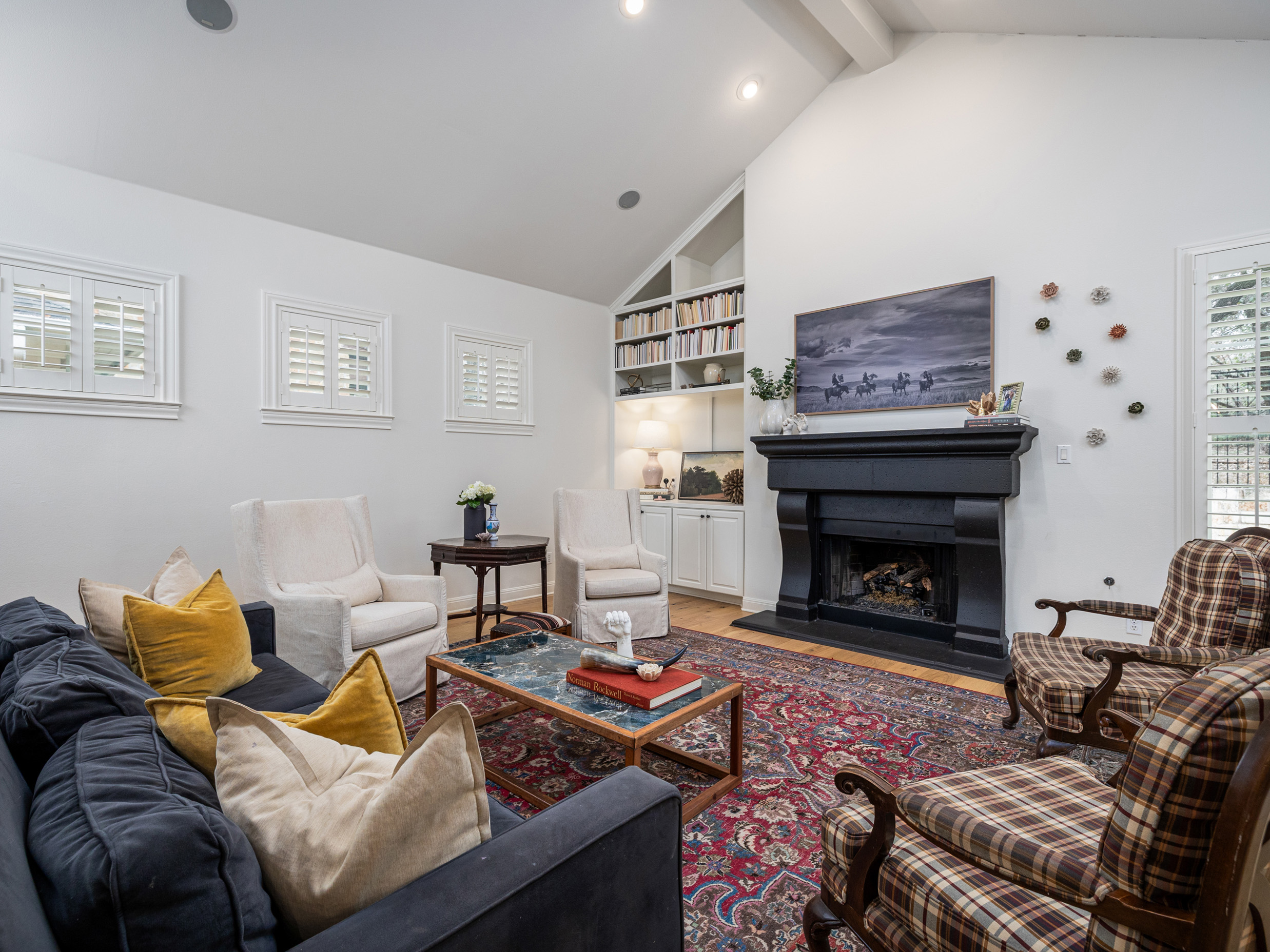 The living room serves as a true gathering space, featuring vaulted ceilings, a gas fireplace, and abundant natural light. Its seamless connection to the kitchen and views to the outdoor living areas create an inviting indoor-outdoor flow, ideal for both daily living and effortless entertaining.