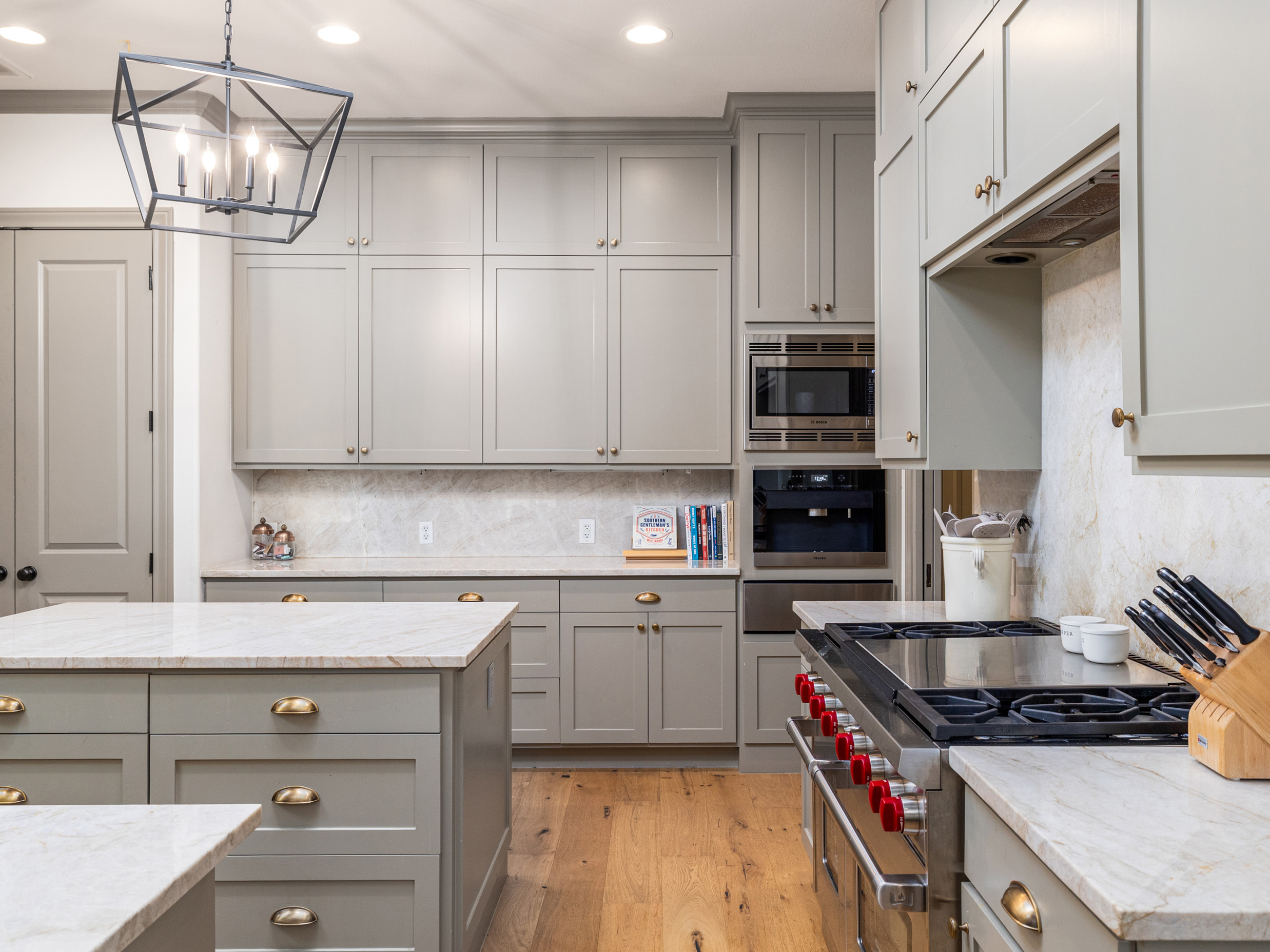 The kitchen is anchored by quartzite countertops and premium appliances, including a Wolf double oven, Miele built-in coffee maker, and wine refrigerator. A dedicated breakfast nook overlooks the backyard pool and tranquil greenspace, while thoughtful details- such as a built-in bar between the kitchen and laundry room and a coffee bar tucked beneath the staircase- elevate everyday living with both beauty and function.