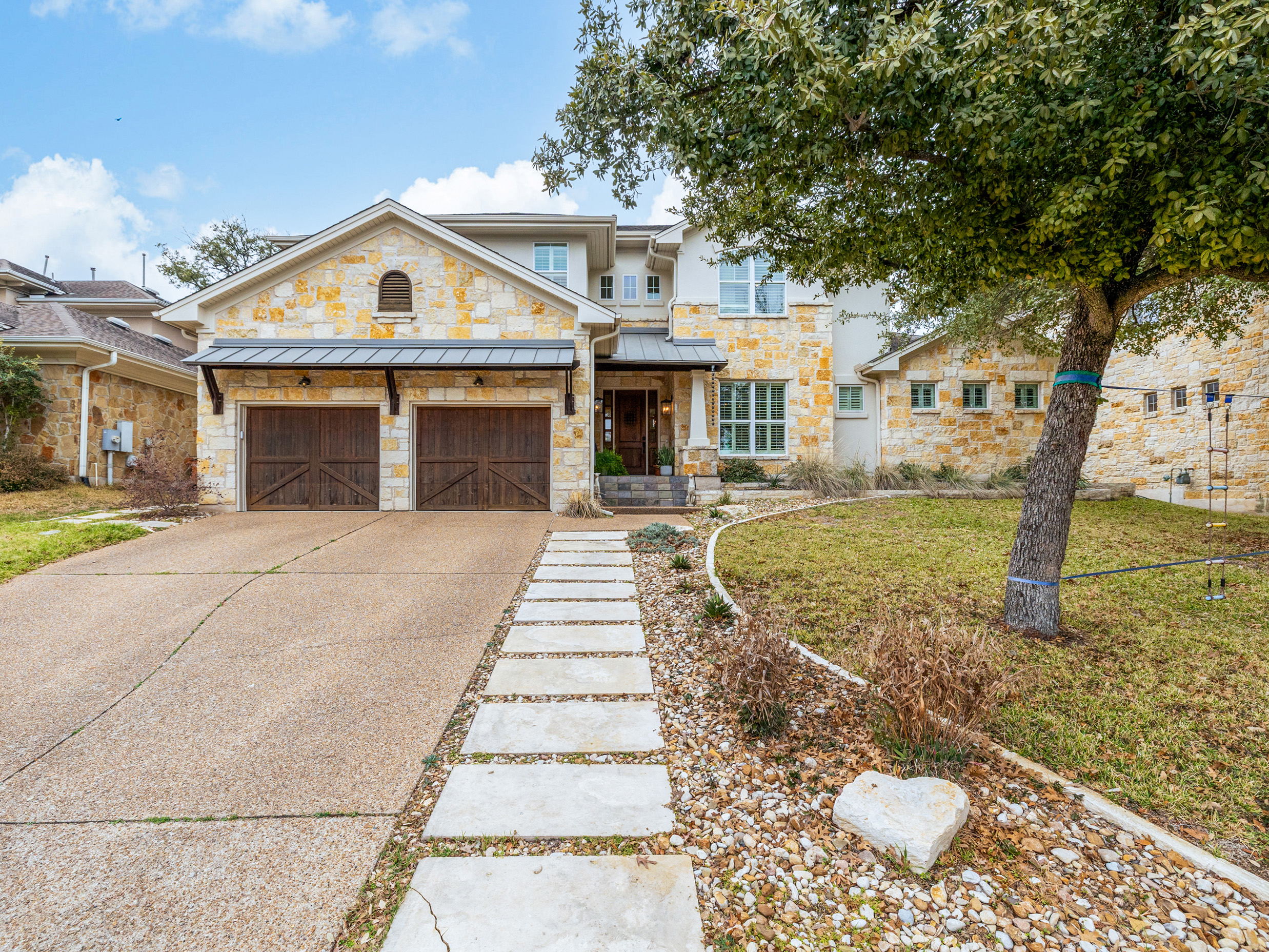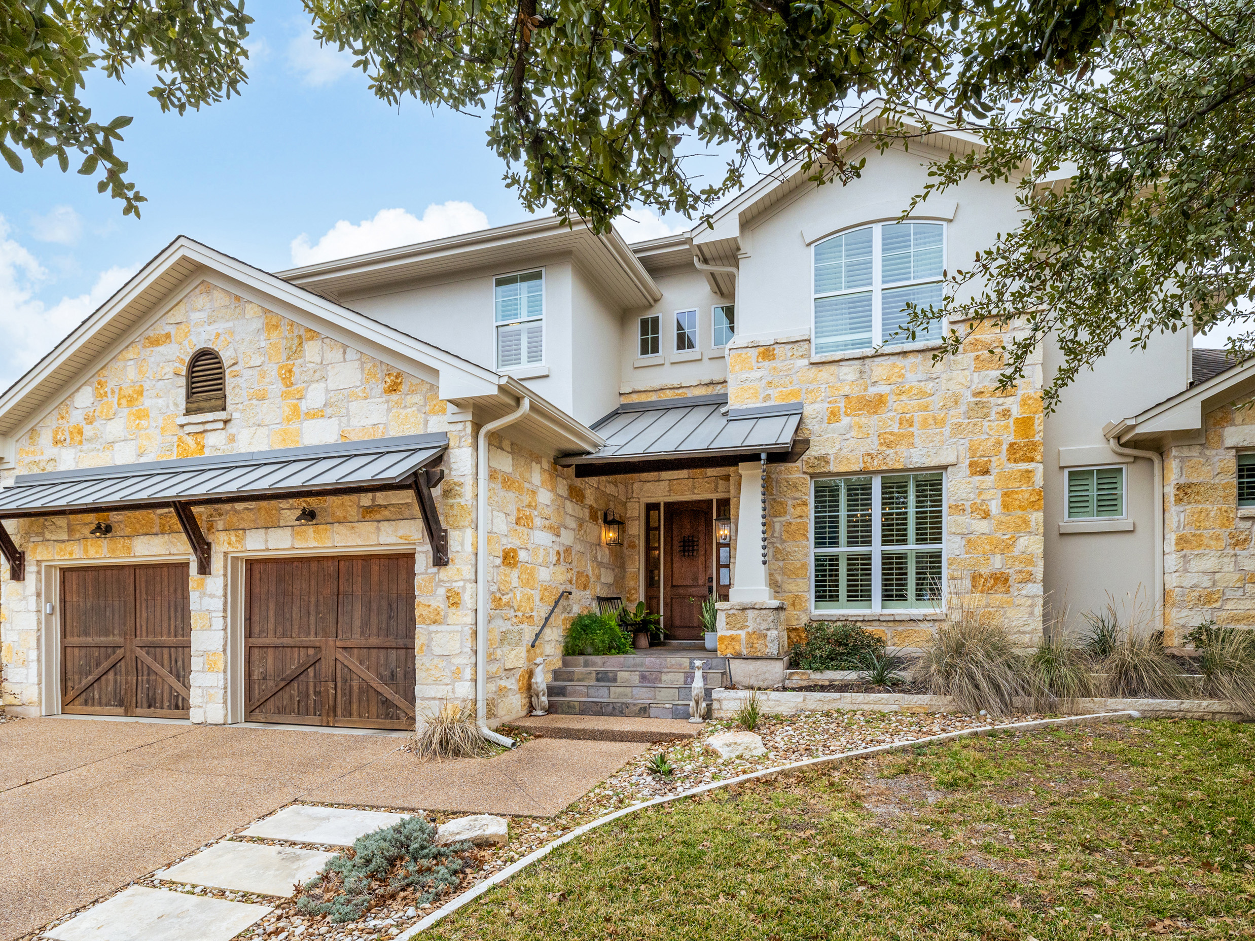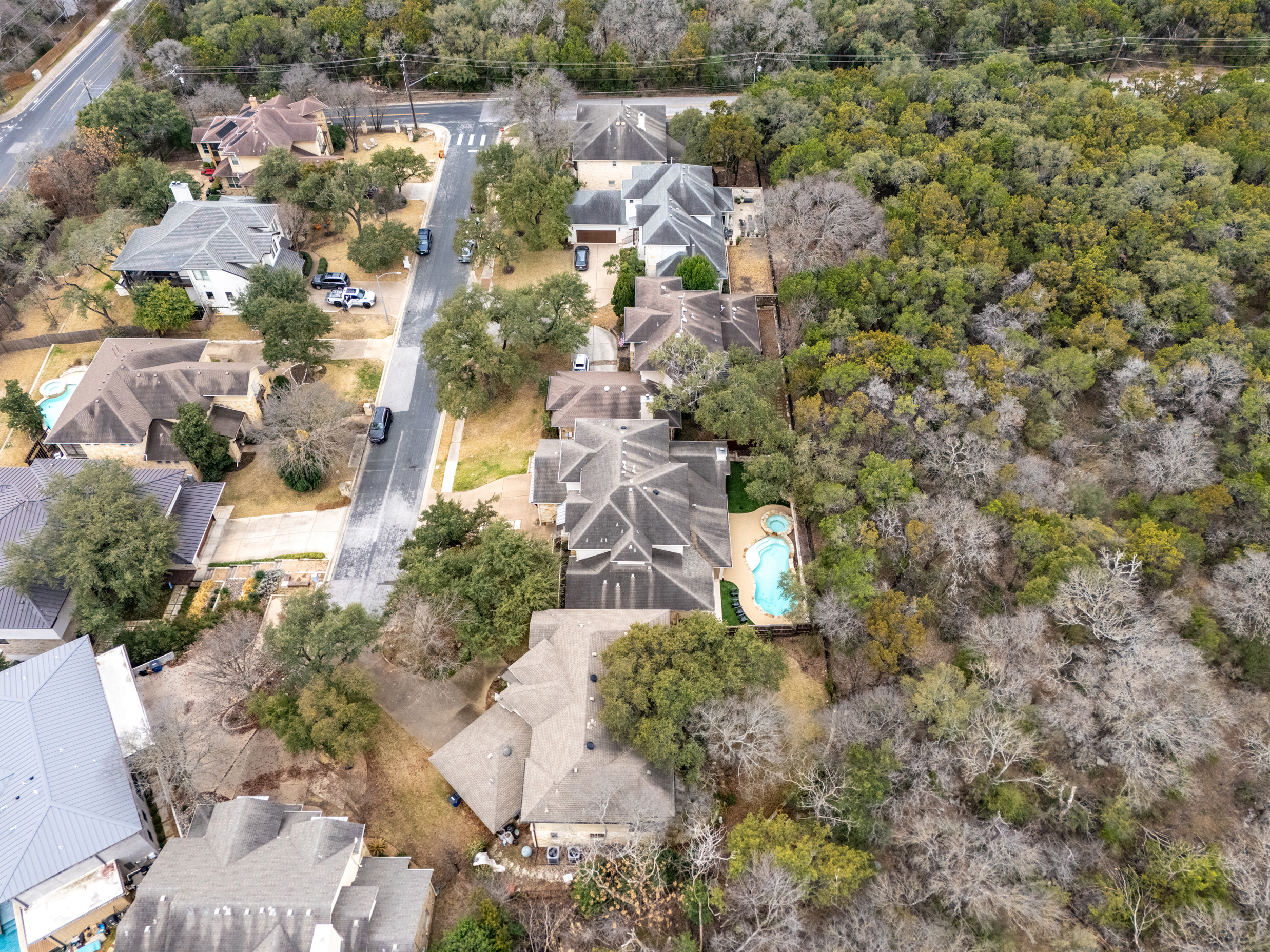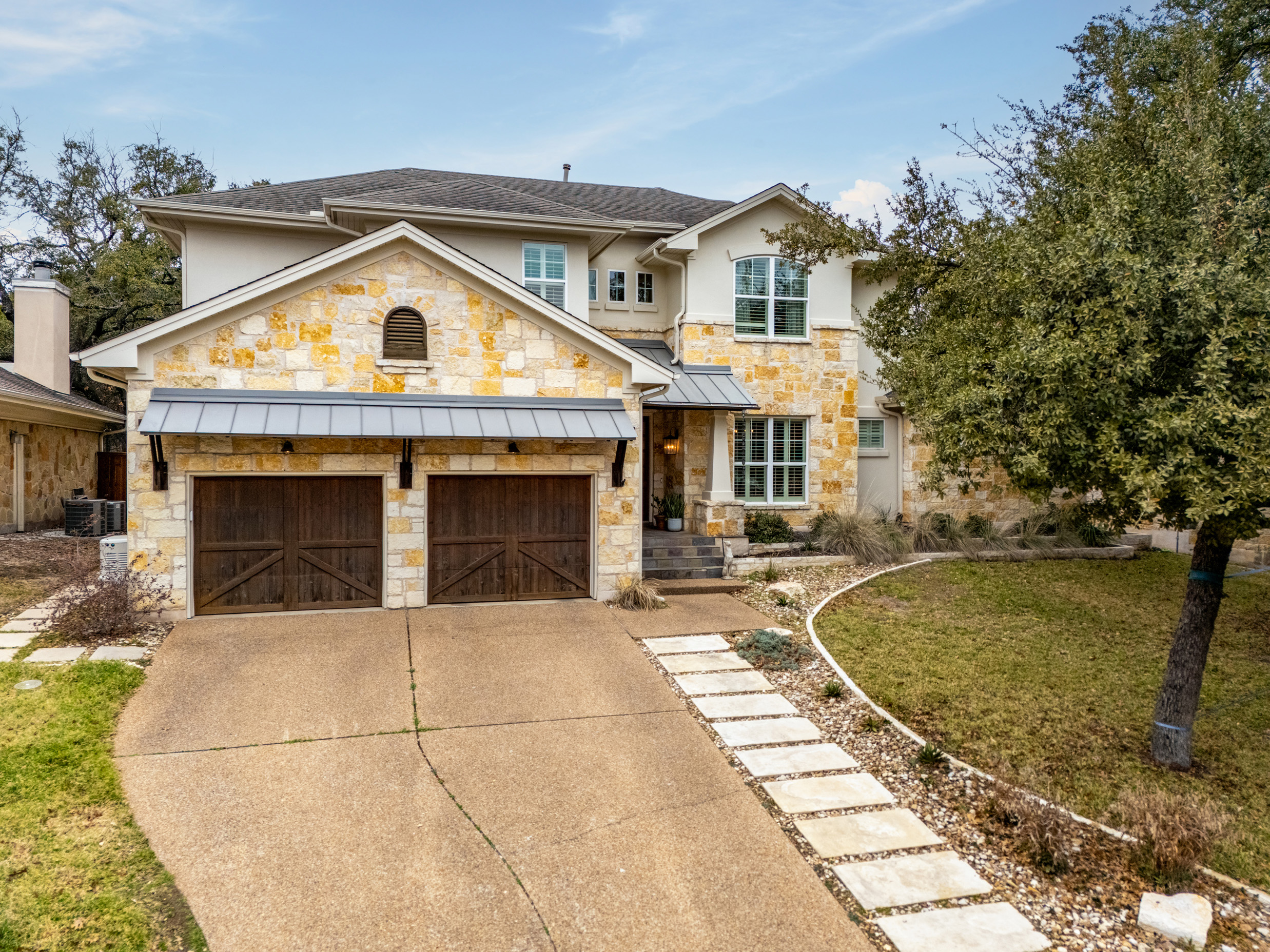 Located in The Overlook at Treemont in Westlake, this refined residence is tucked away on a quiet cul-de-sac, offering privacy, walkability, and a serene greenspace backdrop- within walking distance to Cedar Creek Elementary and Hill Country Middle School. A dramatic 20-foot foyer creates a striking first impression, crowned by a draped glass bronze chandelier that sets the tone for the home’s design-forward sophistication. White oak flooring flows throughout, complemented by plantation shutters, custom paint colors, and carefully curated designer details.