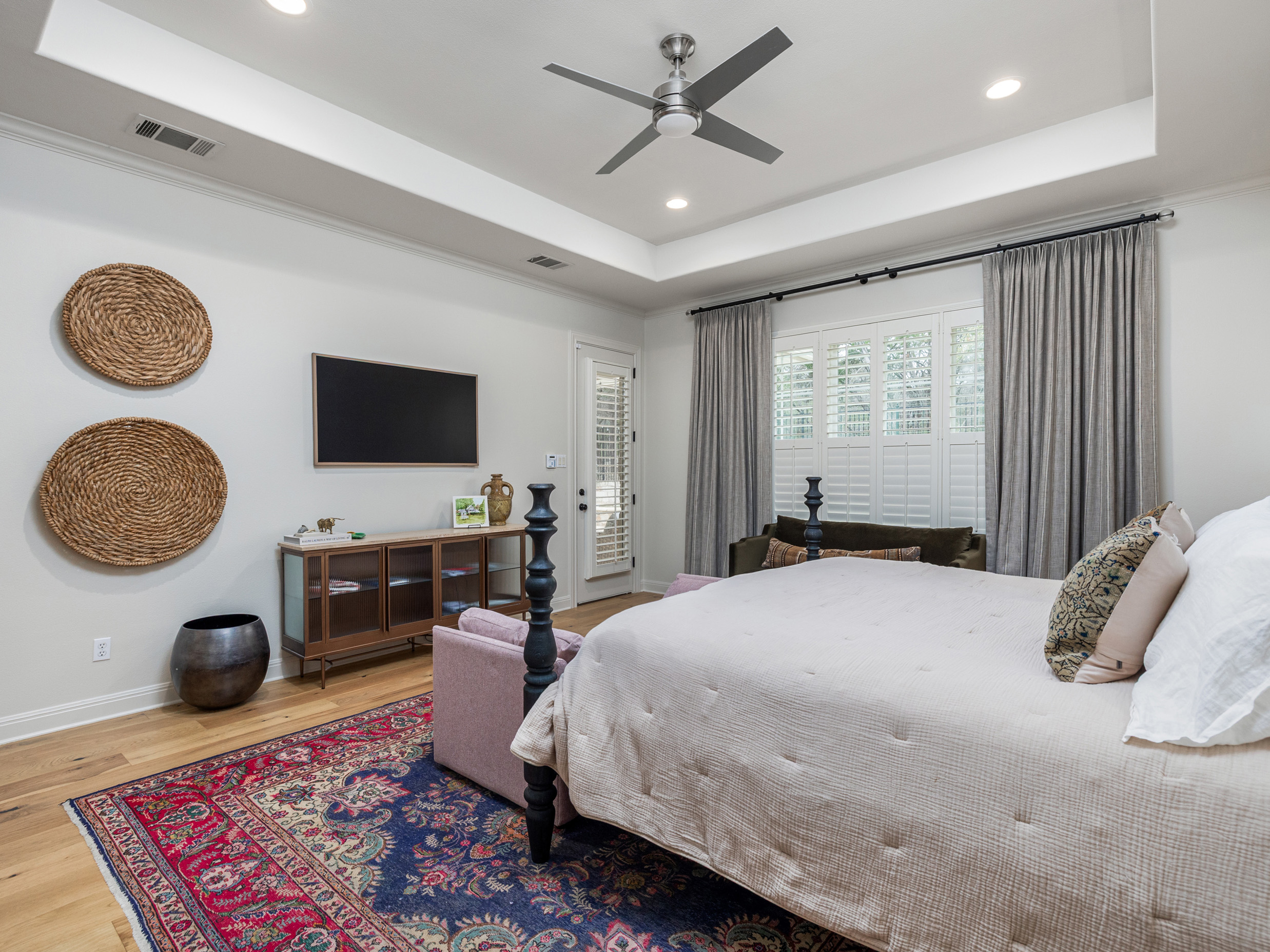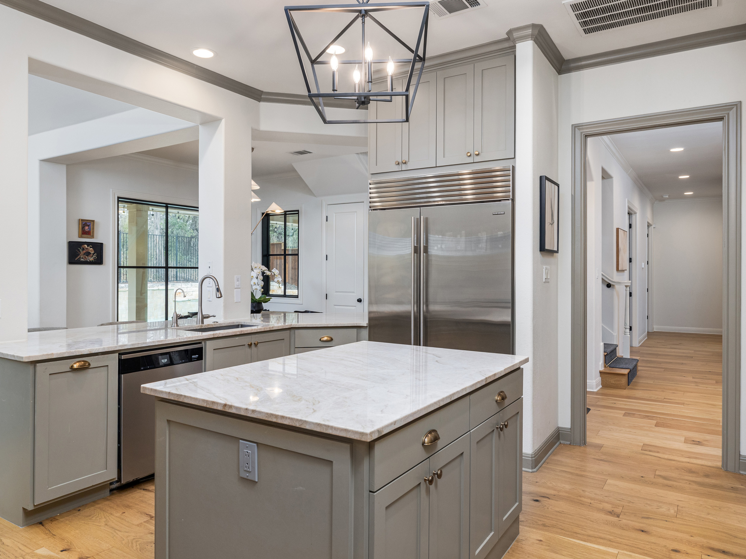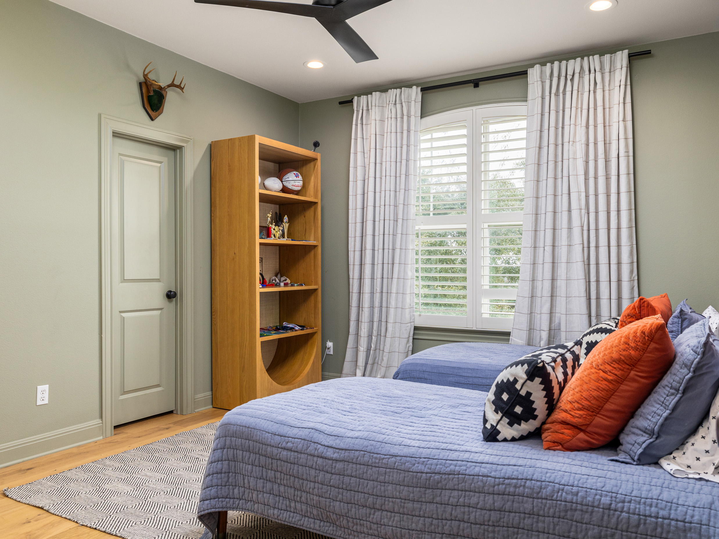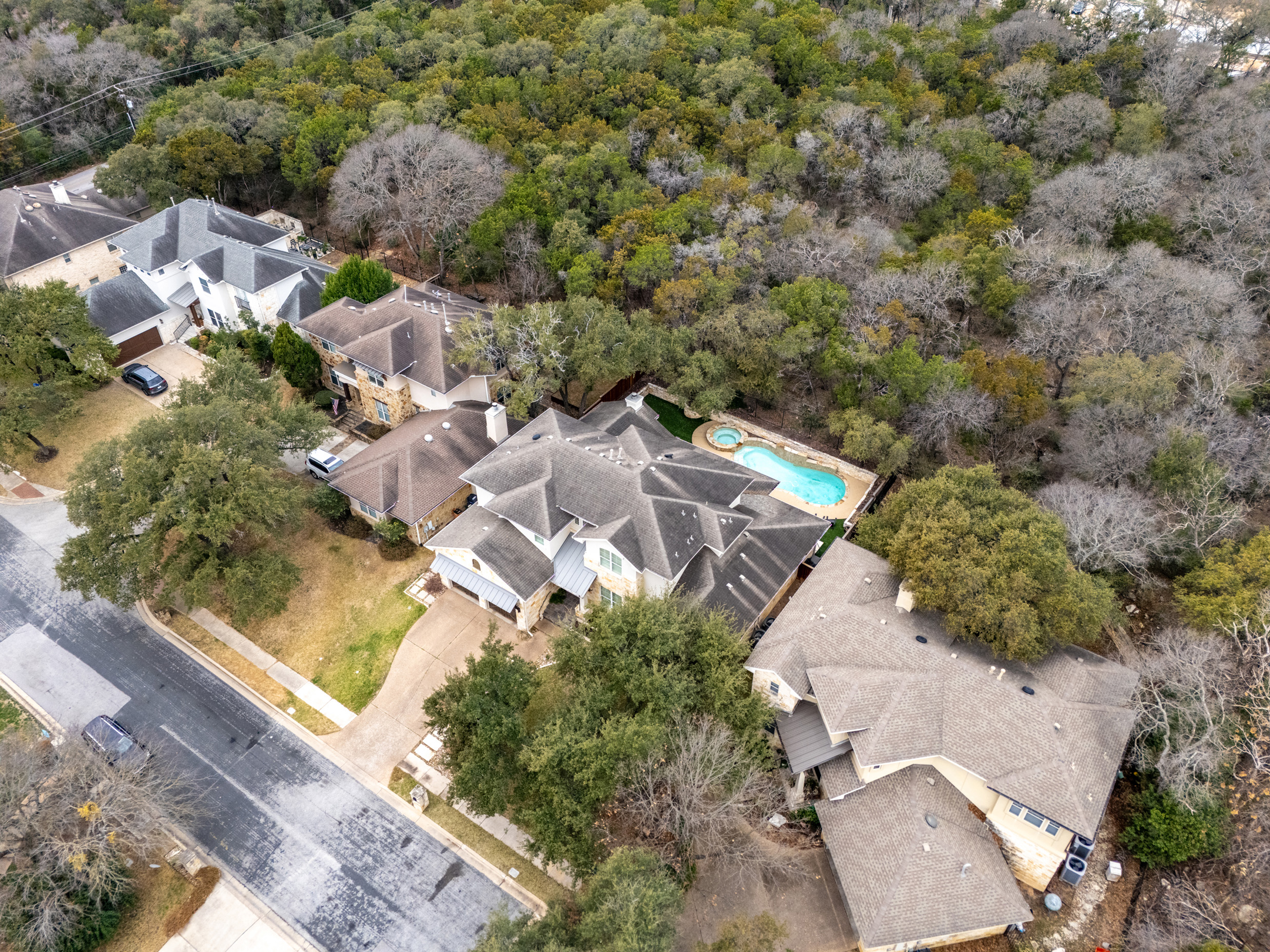 Located in The Overlook at Treemont in Westlake, this refined residence is tucked away on a quiet cul-de-sac, offering privacy, walkability, and a serene greenspace backdrop- within walking distance to Cedar Creek Elementary and Hill Country Middle School. A dramatic 20-foot foyer creates a striking first impression, crowned by a draped glass bronze chandelier that sets the tone for the home’s design-forward sophistication. White oak flooring flows throughout, complemented by plantation shutters, custom paint colors, and carefully curated designer details.
