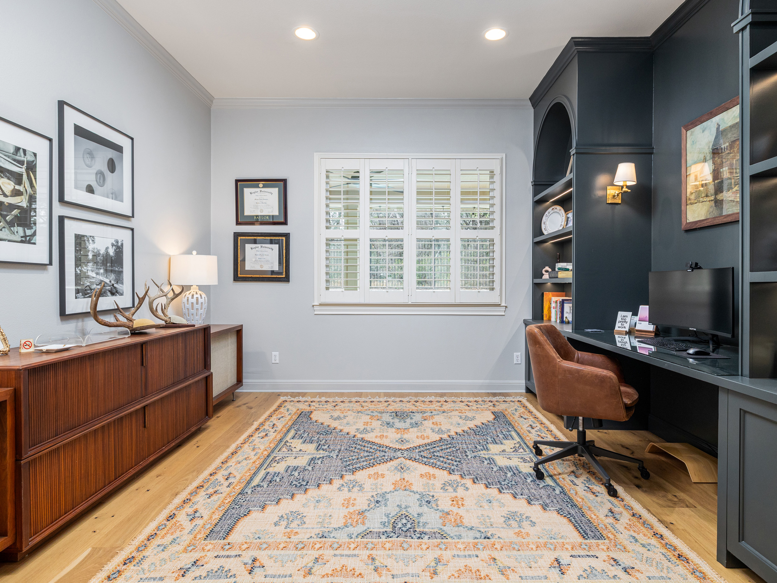 A downstairs office with built-in desk and storage offers a space that is both intentionally functional and aesthetically pleasing. With easy access to a full bathroom, it can also serve as a flexible fifth bedroom, ideal for guests or evolving lifestyle needs.
