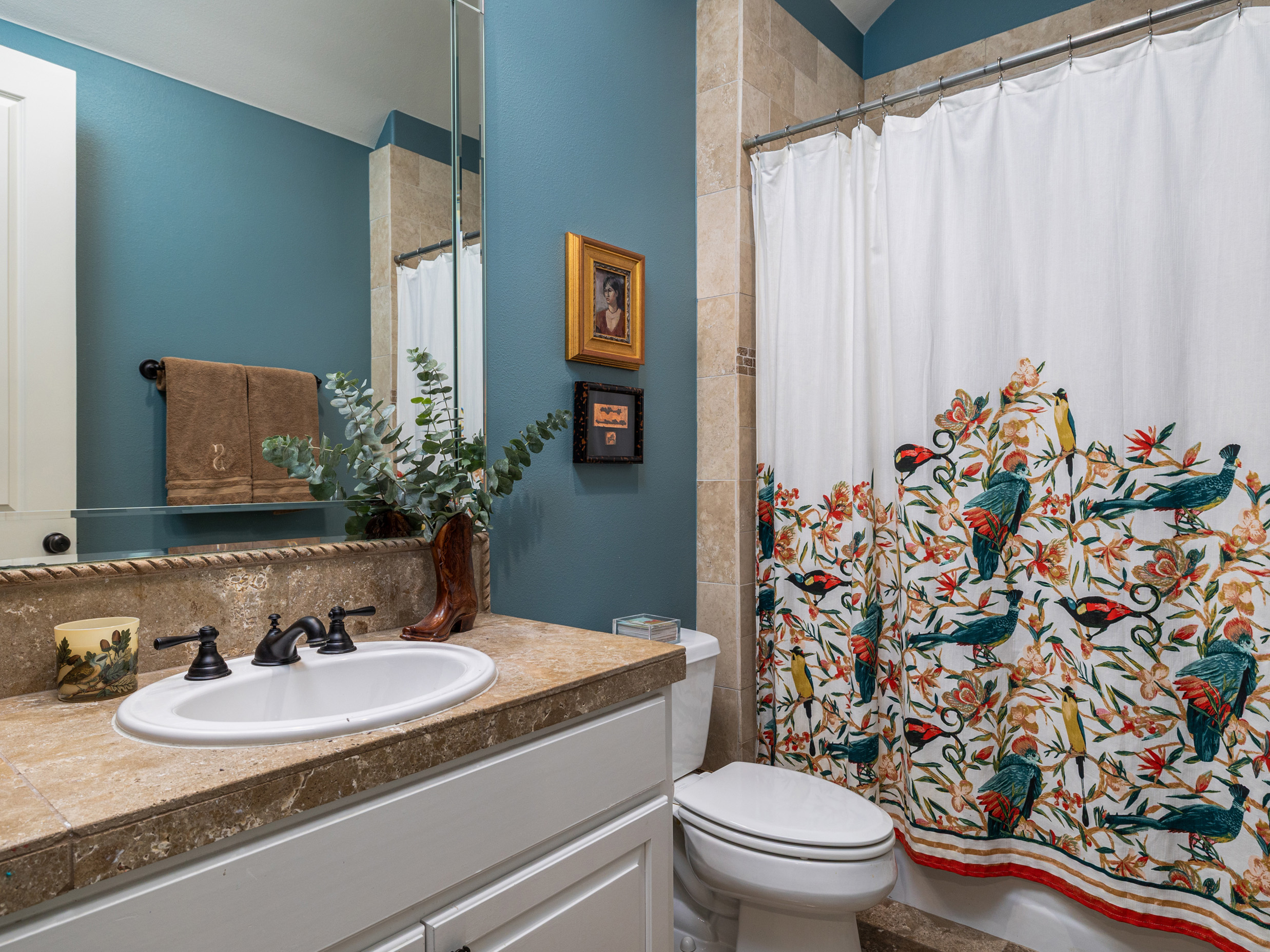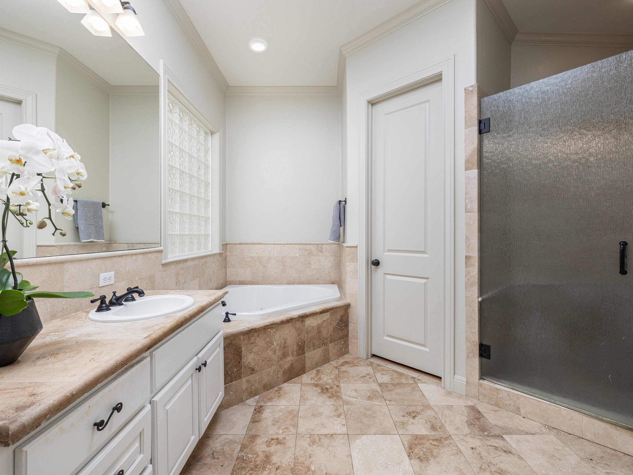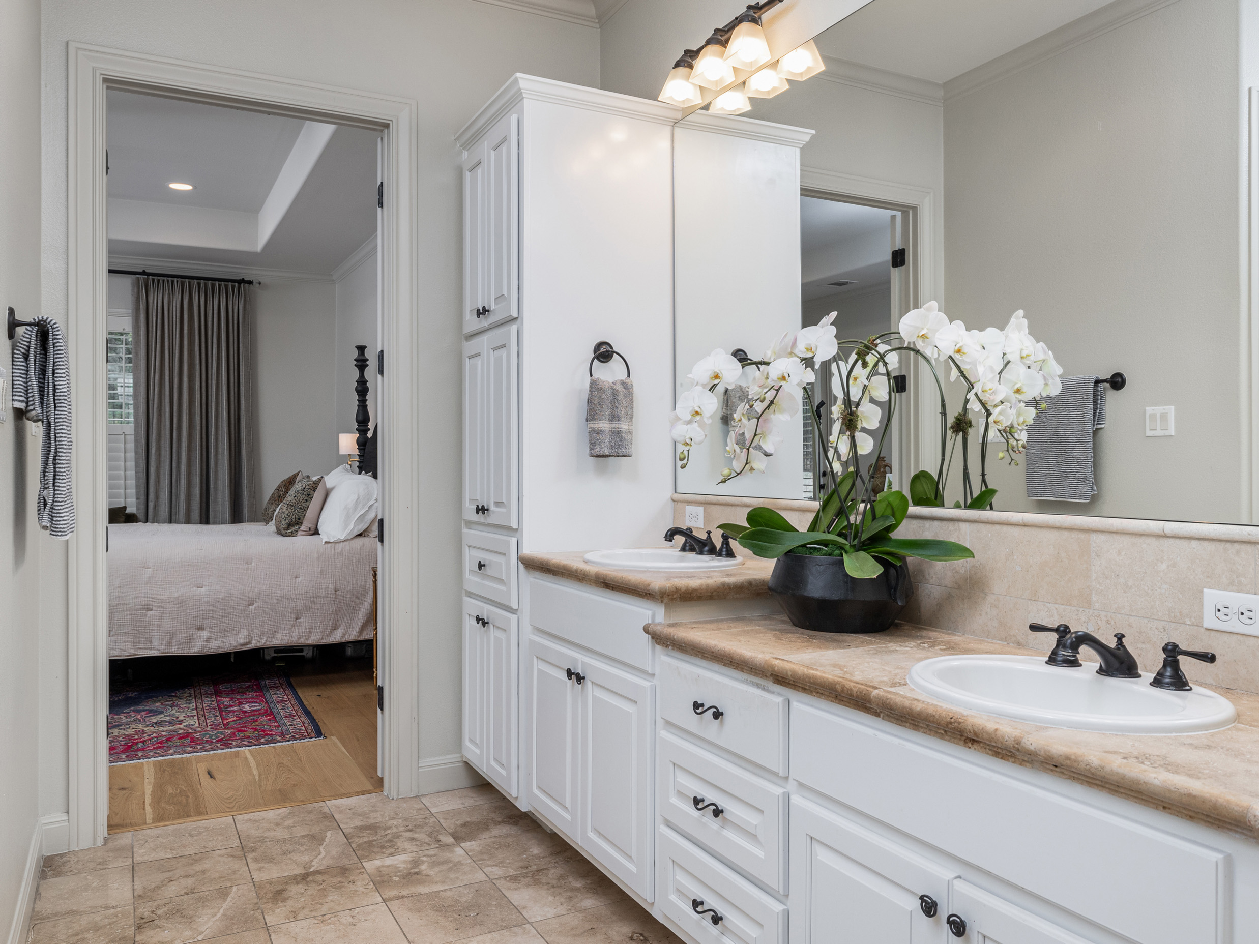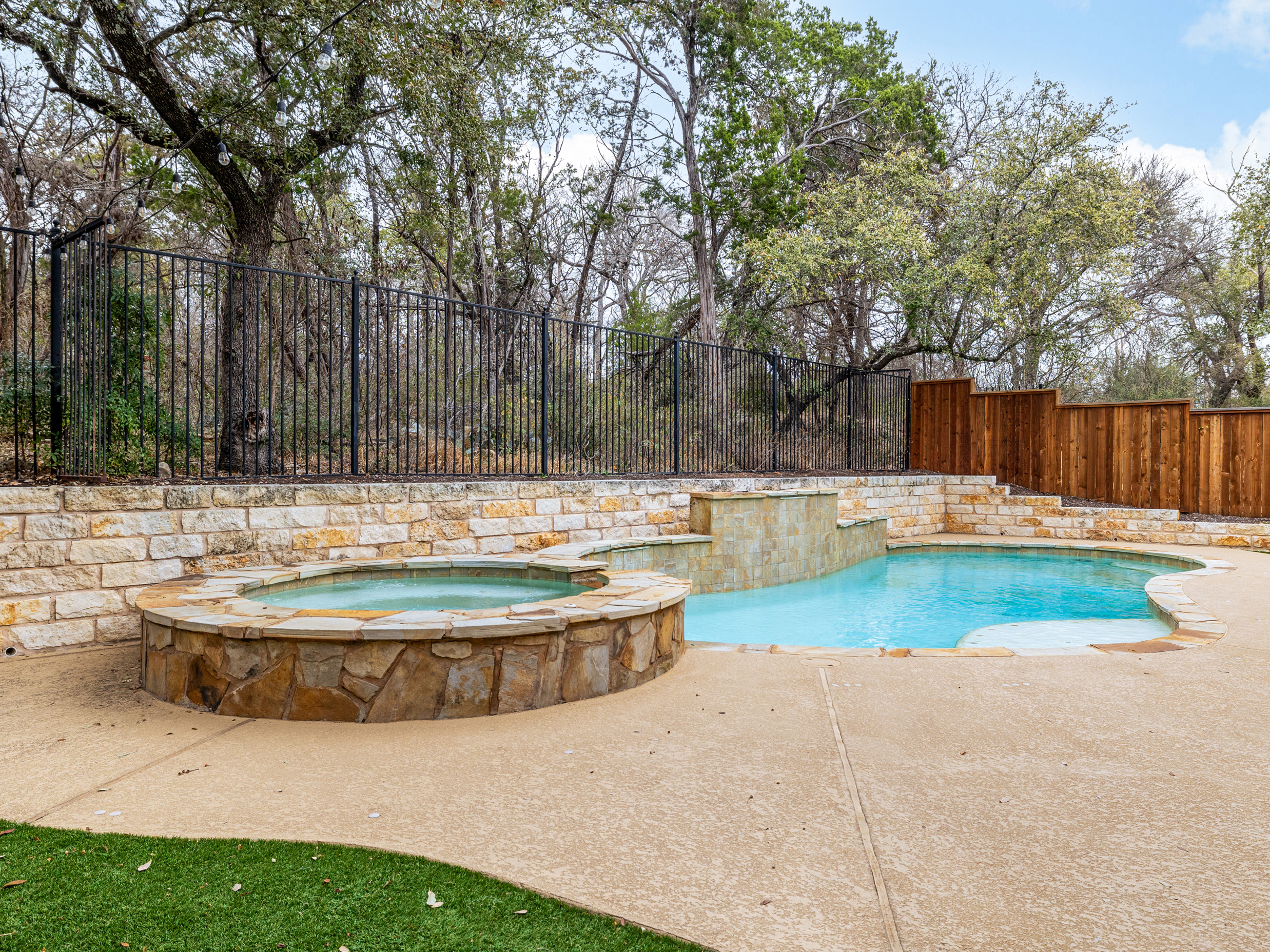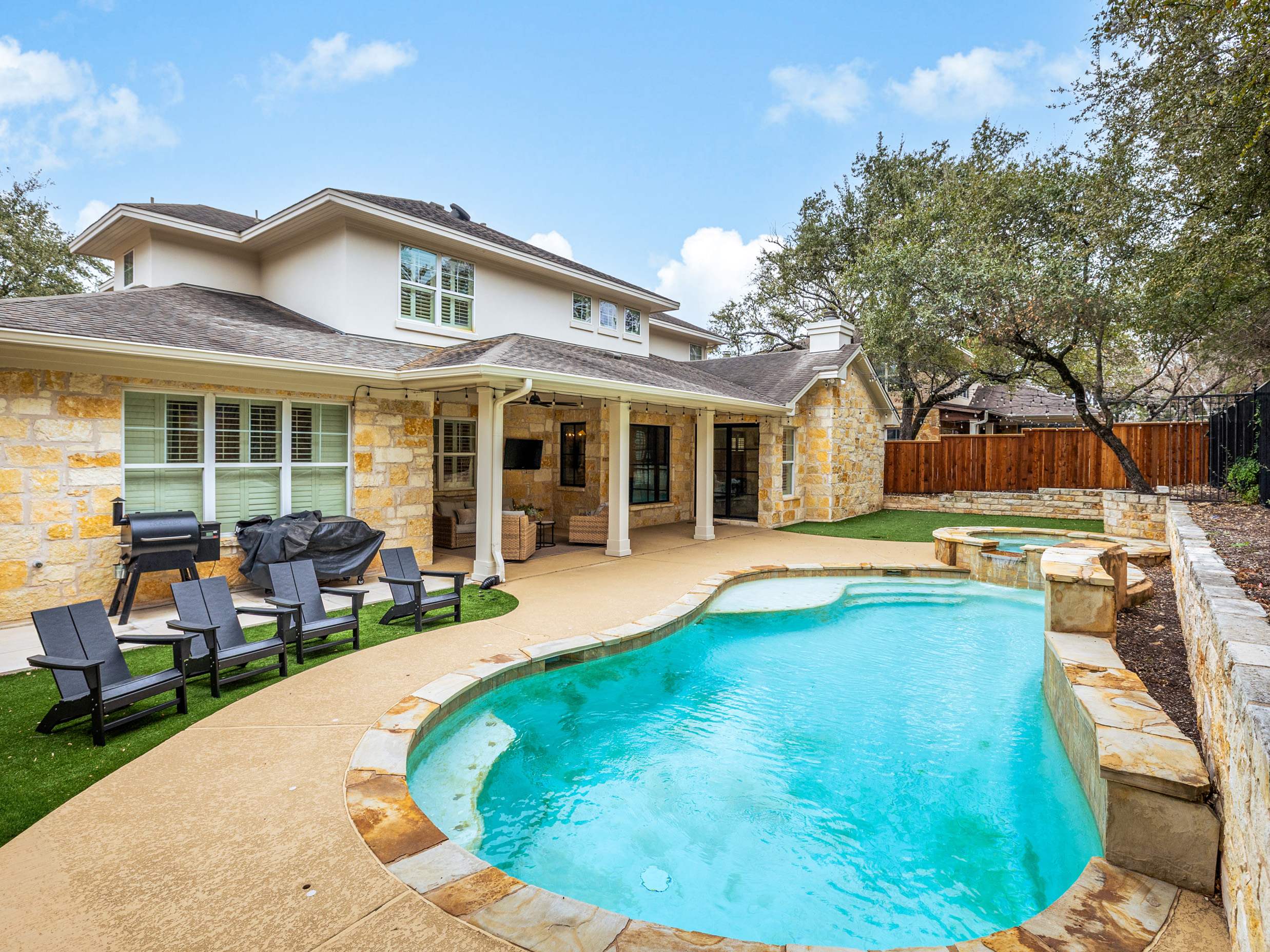 Outdoors, a resort-style pool with cascading waterfall and hot tub overlooks the peaceful greenspace beyond. A backup generator and two-car garage complete this thoughtfully designed home, balancing sophistication, flexibility, and long-term livability within one of Westlake’s most sought-after neighborhoods.