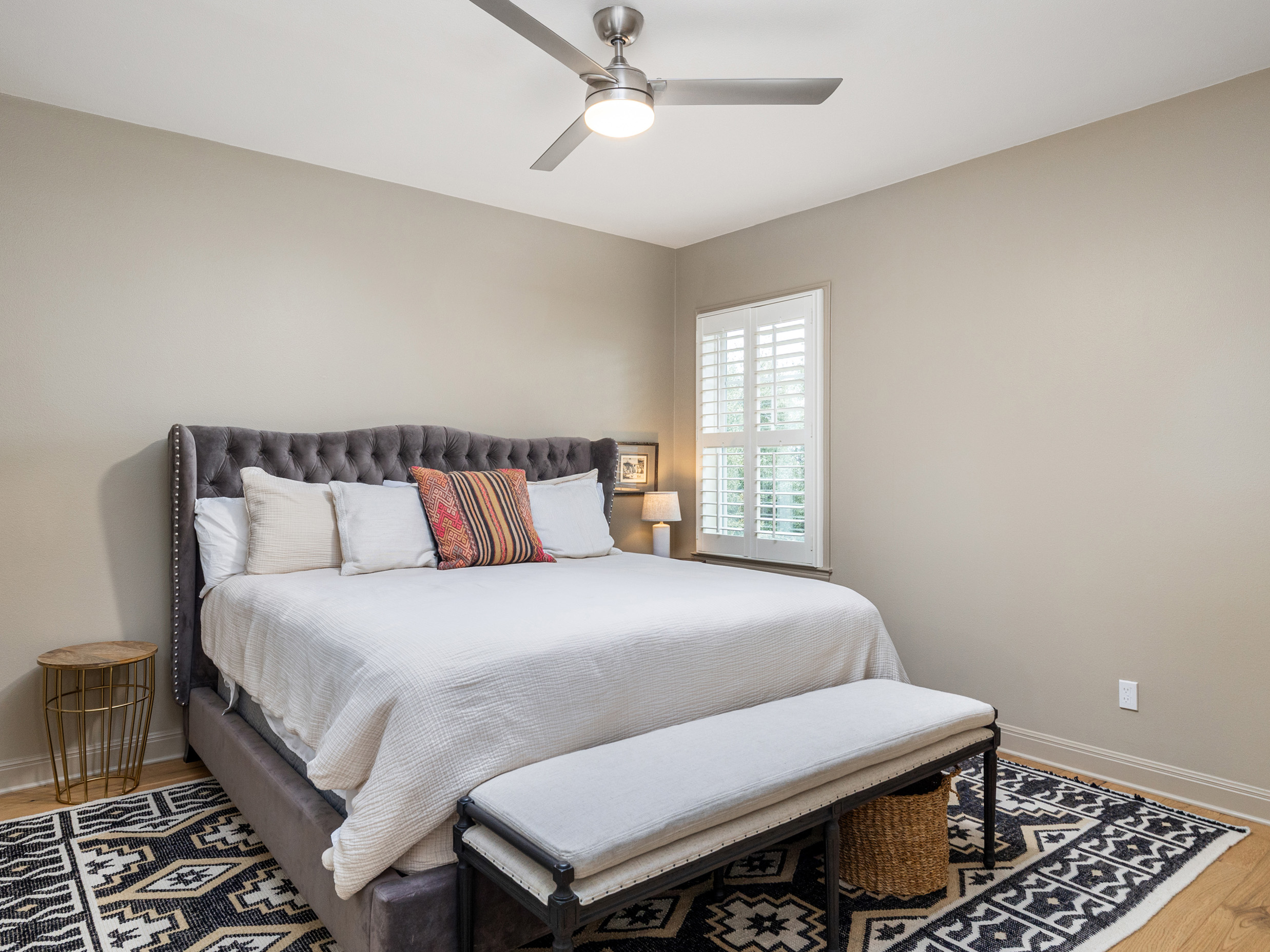 The primary suite is thoughtfully positioned on the main level, privately set apart from the living spaces to create a quiet, restorative retreat. The en-suite bath features a separate soaking tub and walk-in shower, along with a well-organized walk-in closet designed for both function and ease.