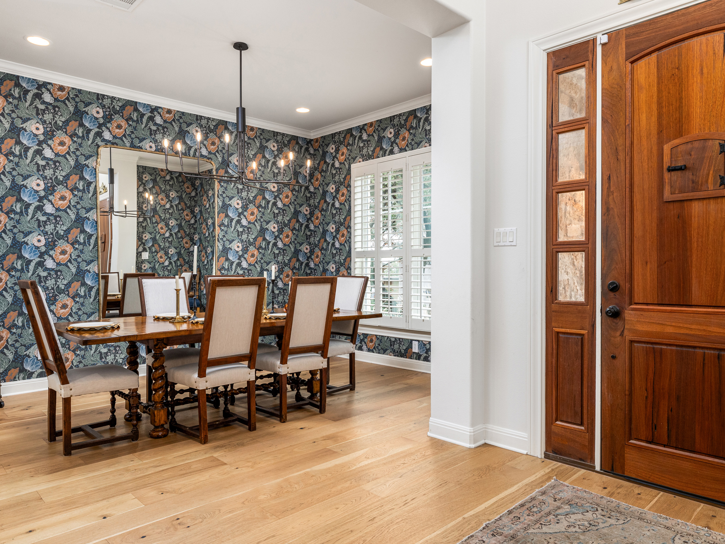 Just off the foyer, a formal dining room makes a bold statement with A-Street Anemone wallpaper and an aged brass chandelier, creating an elegant setting for both intimate dinners and special gatherings.